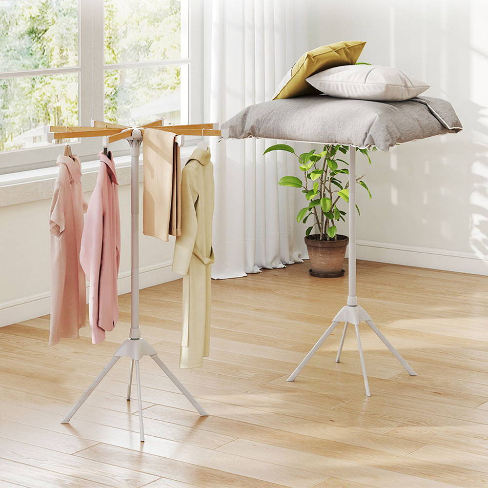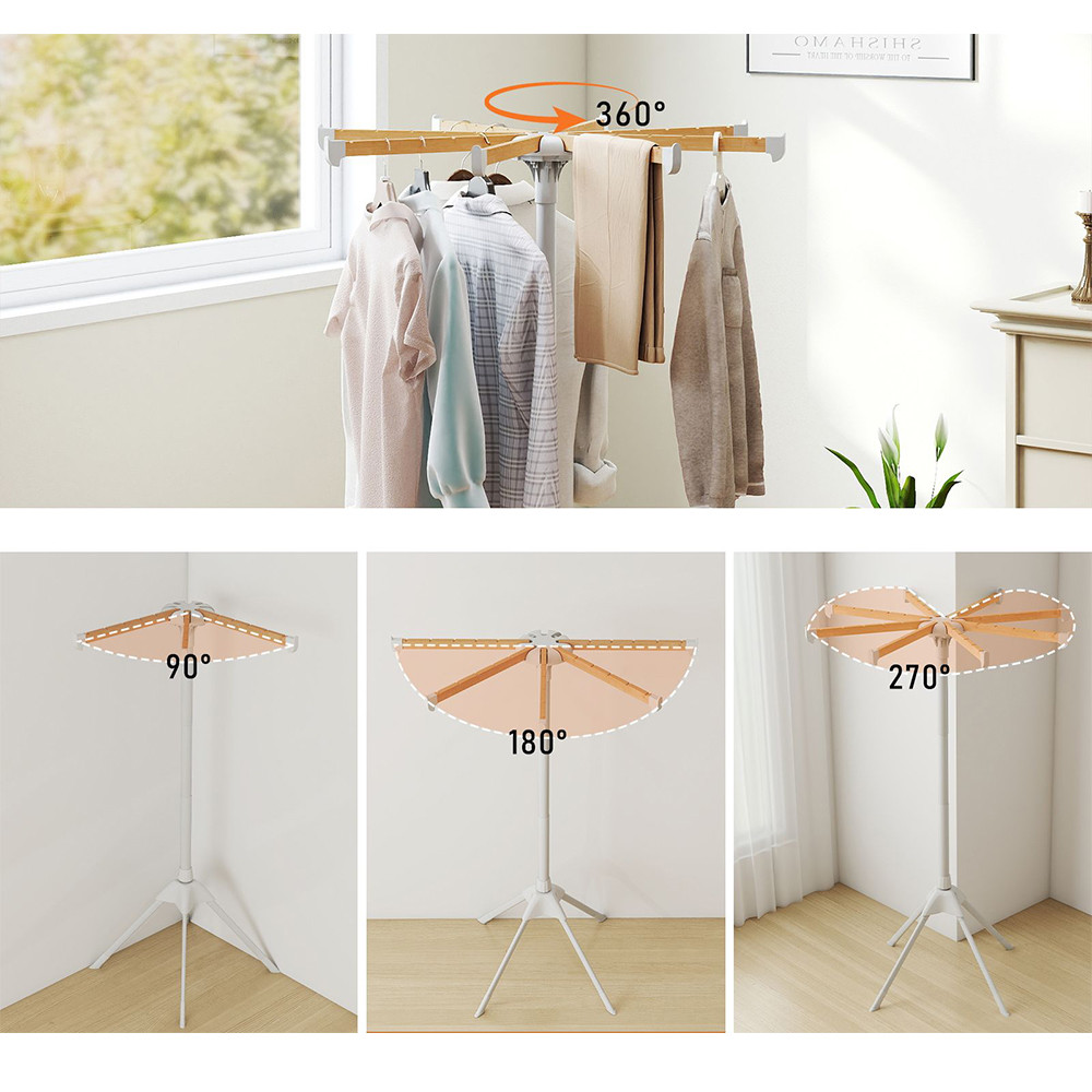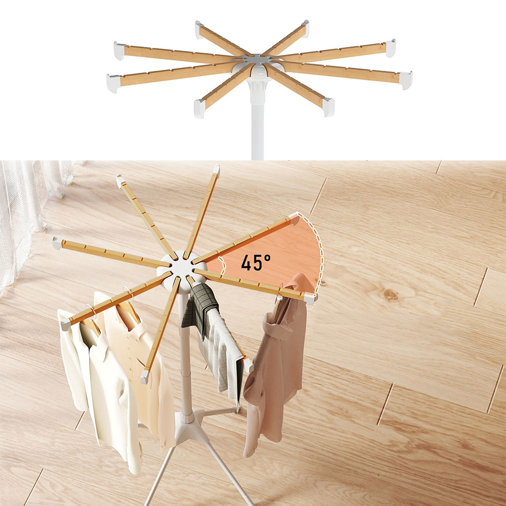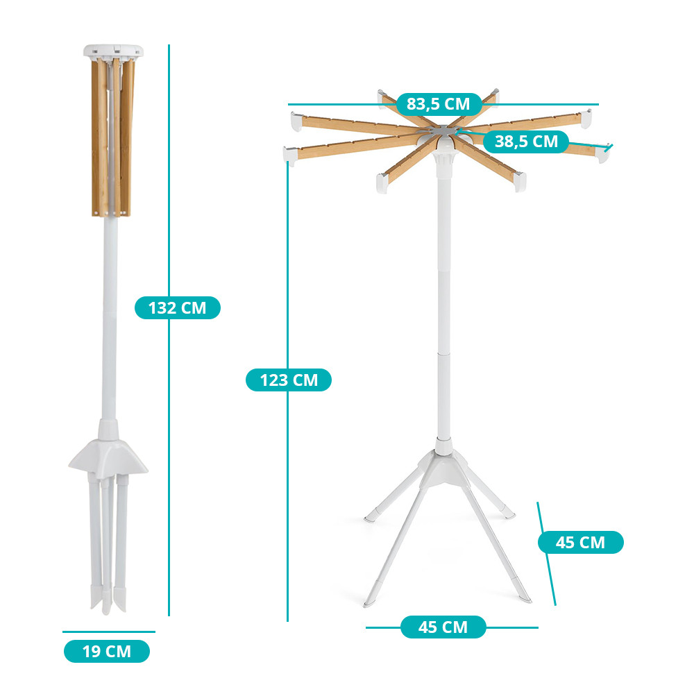 Osiem bambusowych prętów zapewnia łącznie 40 miejsc do wieszania, co pozwala na jednoczesne suszenie koszul, t-shirtów, ręczników lub lżejszych kurtek z dobrą cyrkulacją powietrza.