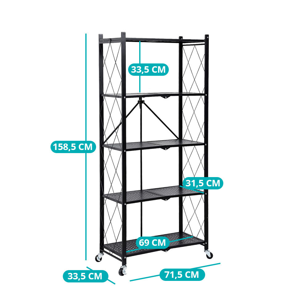 Kółka o średnicy 4 cm ułatwiają przesuwanie, a 33,5 cm odstęp między półkami zapewnia efektywne wykorzystanie przestrzeni. Nośność do 100 kg.