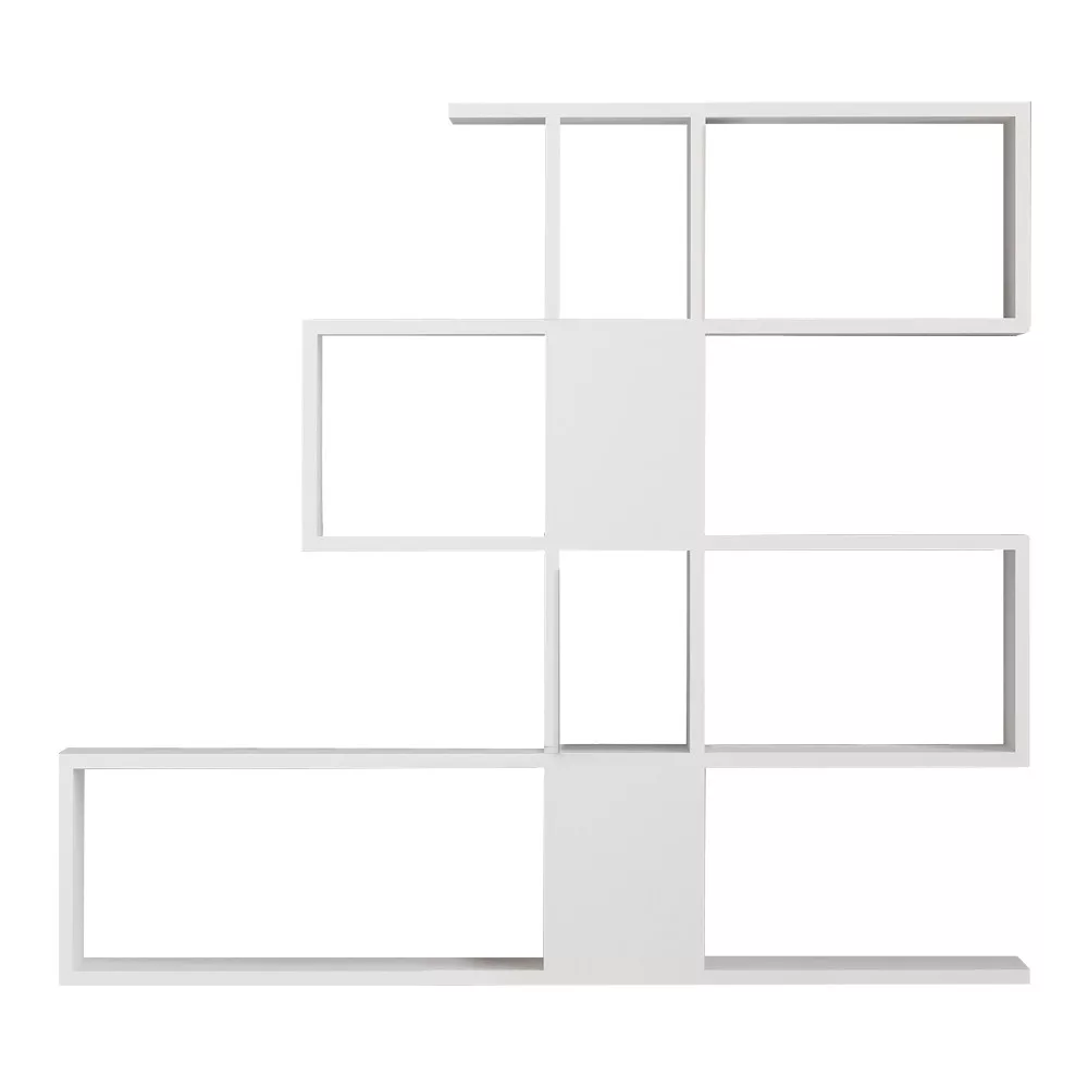 A változatos méretű nyitott rekeszek dinamikus megjelenést kölcsönöznek a térnek. A polc nemcsak tárol, hanem dekorációként is működik.