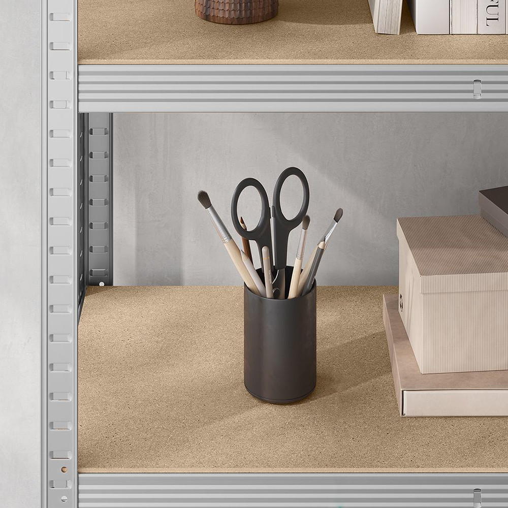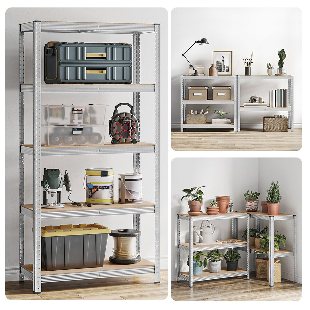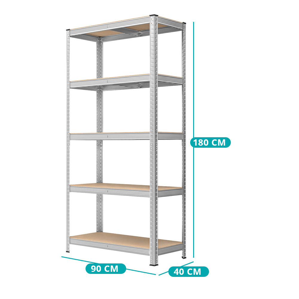 Srebrna stalowa rama oraz płyty MDF nadają półkom praktyczny, schludny wygląd. Pasuje do każdego warsztatu lub pomieszczenia gospodarczego, a przy tym zwiększa poczucie ładu i organizacji przestrzeni.