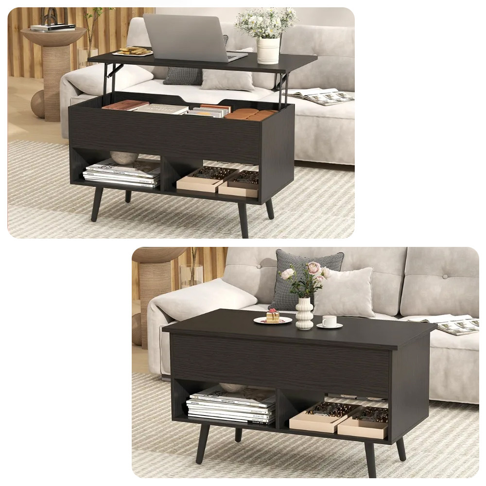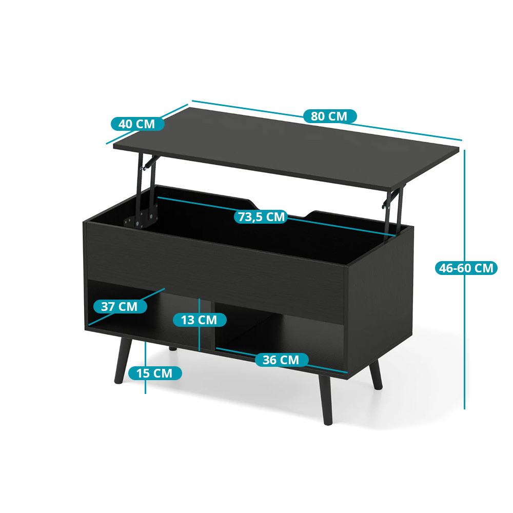 Ten stół kawowy łatwo dostosowuje się do Twoich potrzeb: dzięki podnoszonemu blatu można go wygodnie używać do jedzenia, pracy na laptopie lub relaksu na kanapie. Jednym ruchem przekształca się w centralny element Twojego salonu lub praktyczną powierzchnię roboczą.