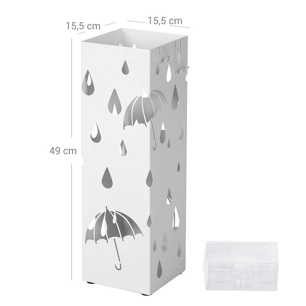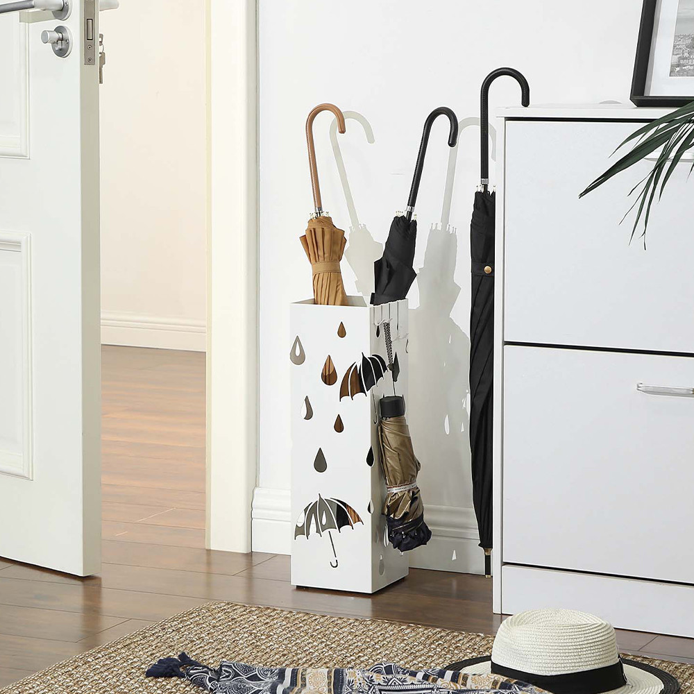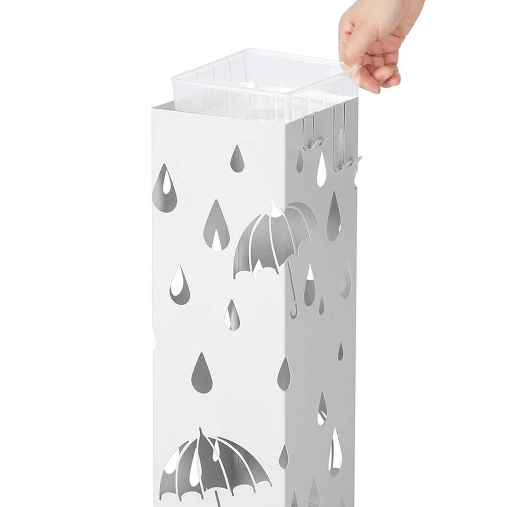 Czysty biały kolor i motyw wyciętych kropli deszczu pasują do każdego stylu. Może być używany zarówno w domu, jak i w biurze, pozwalając na schludne przechowywanie parasoli w stylowym, estetycznym elemencie.