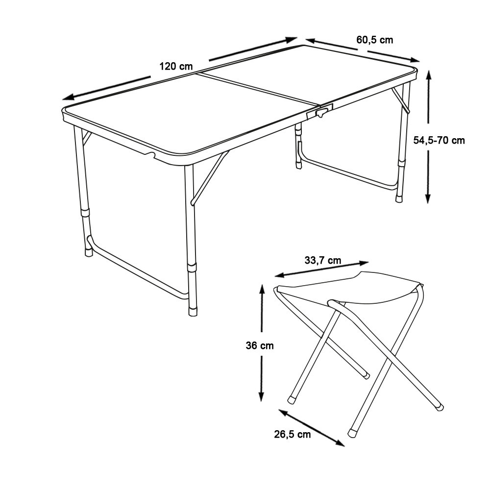 Stół można ustawić na trzech poziomach wysokości (54,5 cm, 61,5 cm, 70 cm), co sprawia, że jest wygodny zarówno dla dzieci, jak i dorosłych. Wytrzymała rama zapewnia stabilność nawet na nierównym terenie.