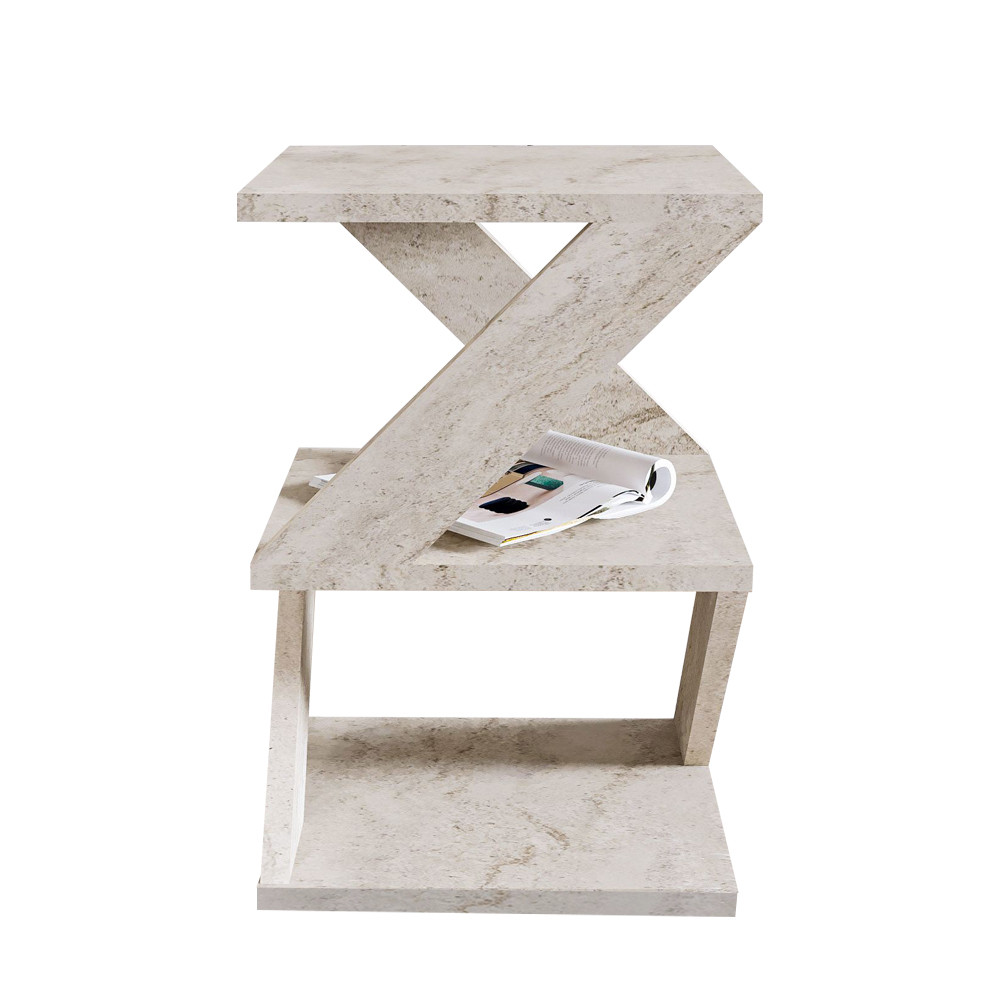 Powierzchnia w efekcie marmuru tworzy elegancką, minimalistyczną atmosferę, która natychmiast przyciąga uwagę. To idealny wybór do postawienia obok sofy w salonie, jako stolik nocny w sypialni, a nawet jako element dekoracyjny w stylowym kącie.