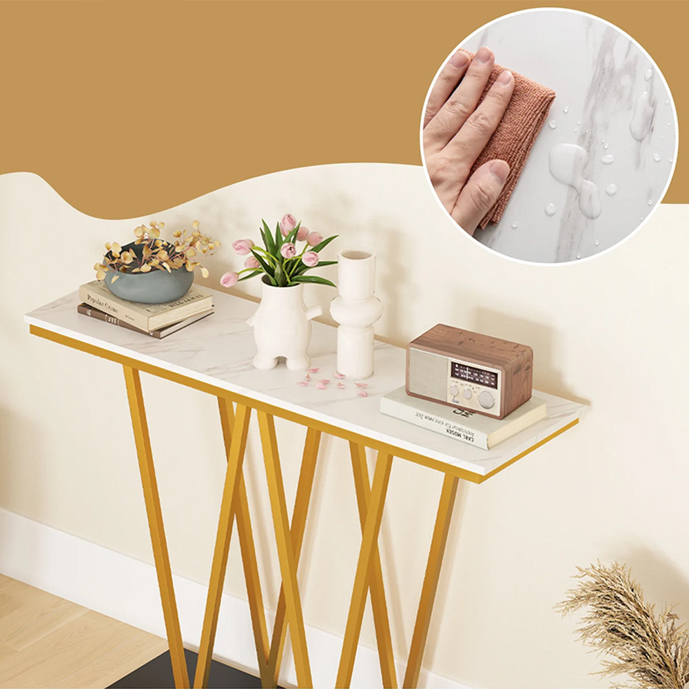 Biały blat o wyglądzie marmuru i złota ramka tworzą elegancki, nowoczesny efekt. Pięknie podkreśla ramkę na zdjęcia lub ulubione dekoracje i łatwo wpasowuje się zarówno w jasne, jak i ciemniejsze wnętrza.