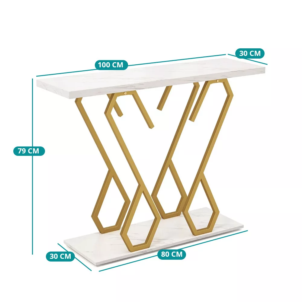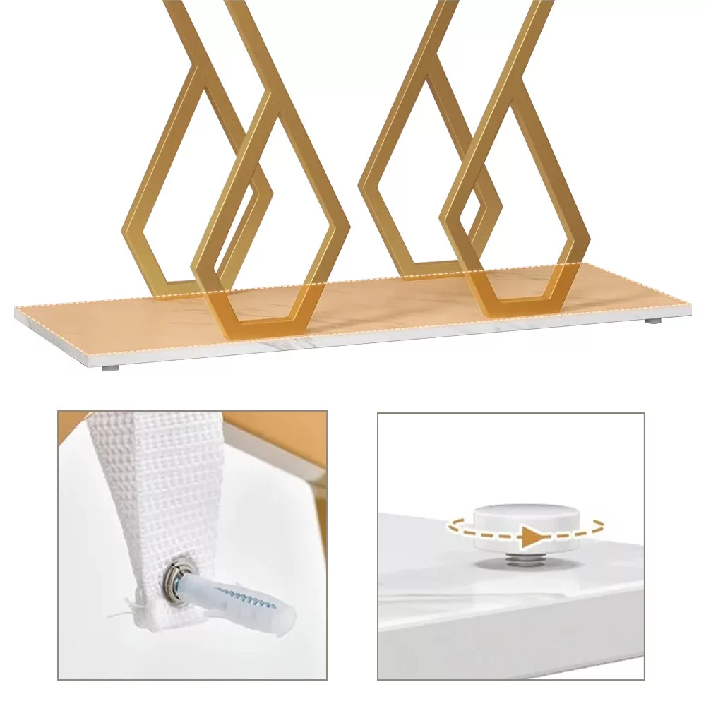 Biały blat z efektem marmuru jest elegancki, a geometryczne nogi w złotym kolorze dodają nowoczesnego charakteru. Doskonale komponuje się z czystym, nowoczesnym lub glamour stylem, dobrze wygląda pod lustrem, w korytarzu lub w salonie.