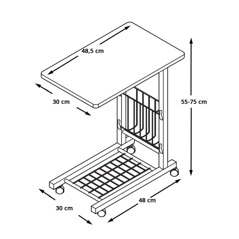 Stojak został wykonany z trwałej metalowej ramy oraz wysokiej jakości blatu z drewna. Kompaktowy, ale pojemny – dolna półka doskonale nadaje się na drobne przedmioty, a boczny schowek pomieści książki, czasopisma czy inne akcesoria.