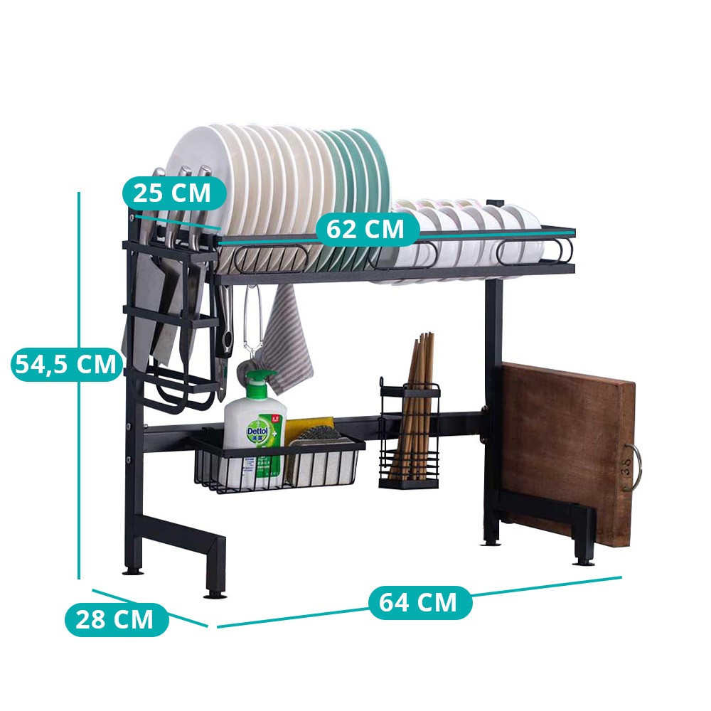 - Pojedyncza suszarka: 54,5×64×28 cm, 3,2 kg, półka 62×25 cm, 14 uchwytów na talerze, opakowanie: 29,5×63×14 cm, 3,7 kg