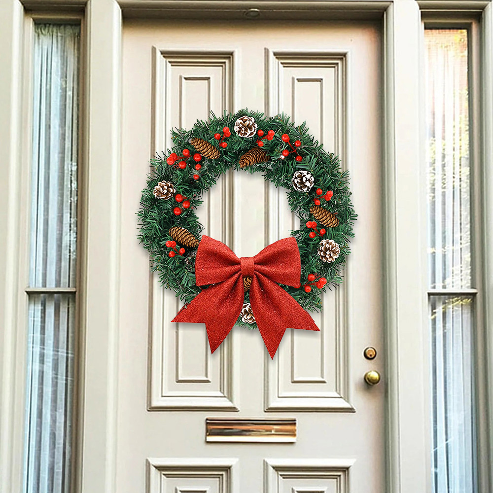 Podstawę wieńca stanowią gęste, realistyczne gałązki sztucznej jodły, które wyglądają jak prawdziwe, ale są trwałe i łatwe w pielęgnacji. Czerwona satynowa kokarda nadaje ozdobie wyjątkowego uroku i podkreśla jej świąteczny charakter.