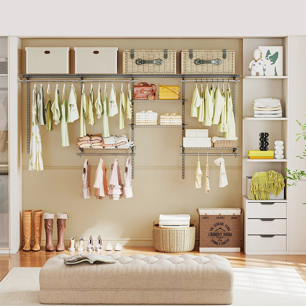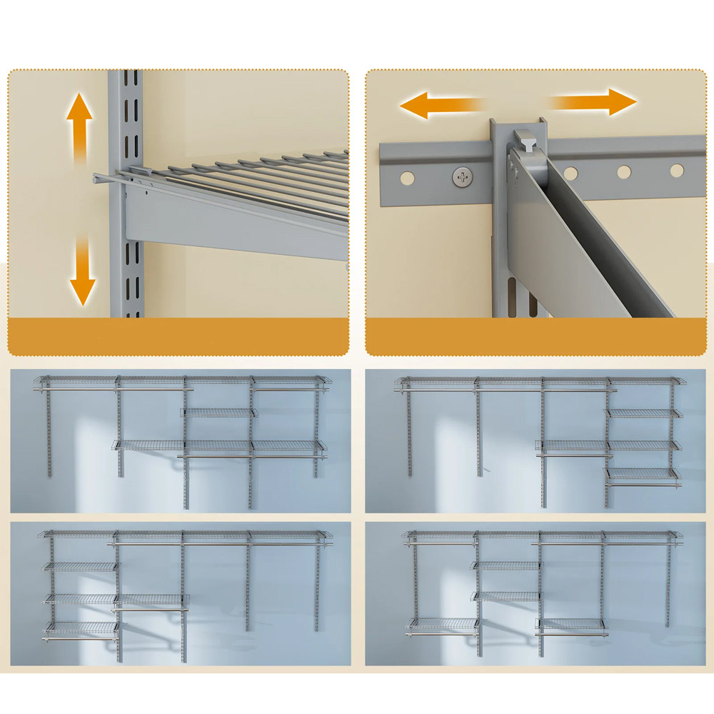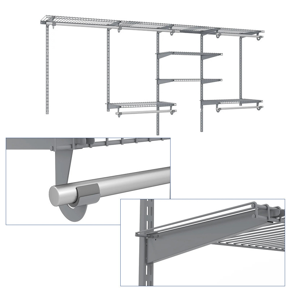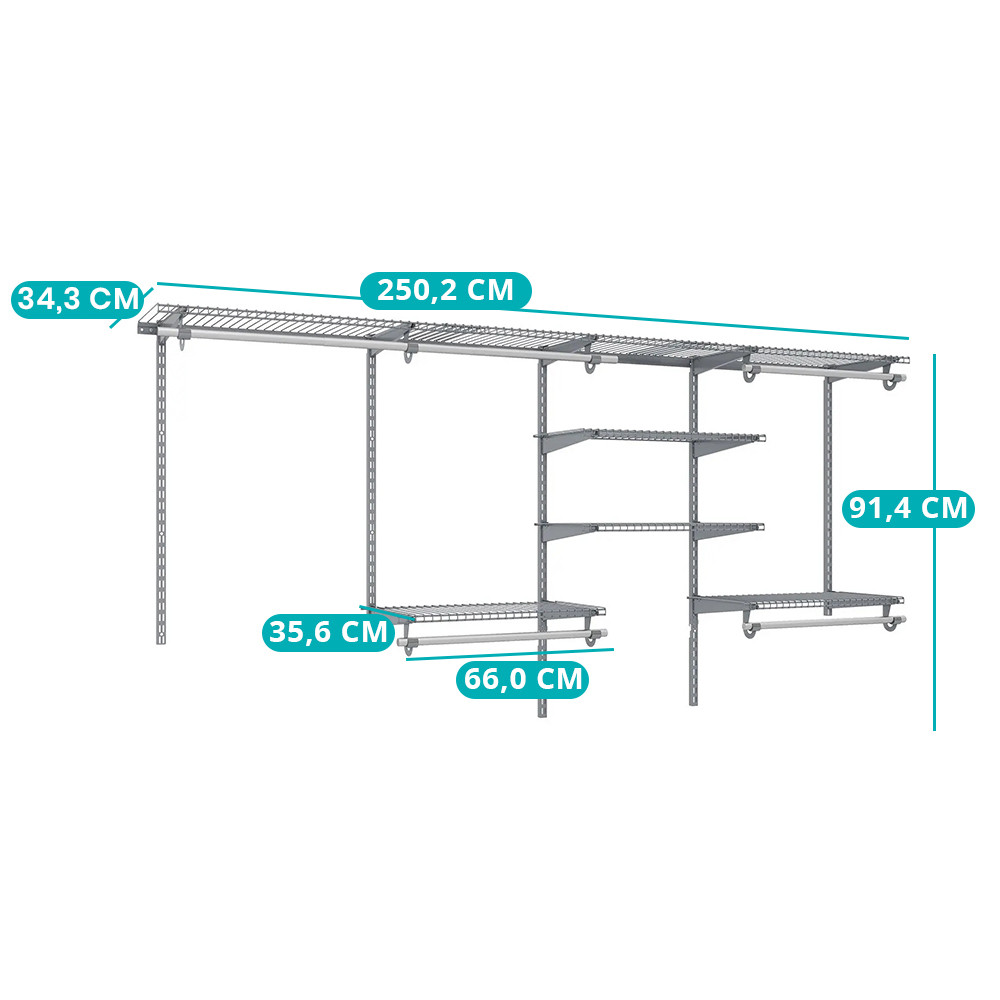 System pasuje do szaf o szerokości od 122 do 244 cm, co pozwala na dostosowanie do indywidualnych potrzeb. Wysokość i układ półek oraz drążków można regulować, co umożliwia każdemu dostosowanie przestrzeni do swoich preferencji.