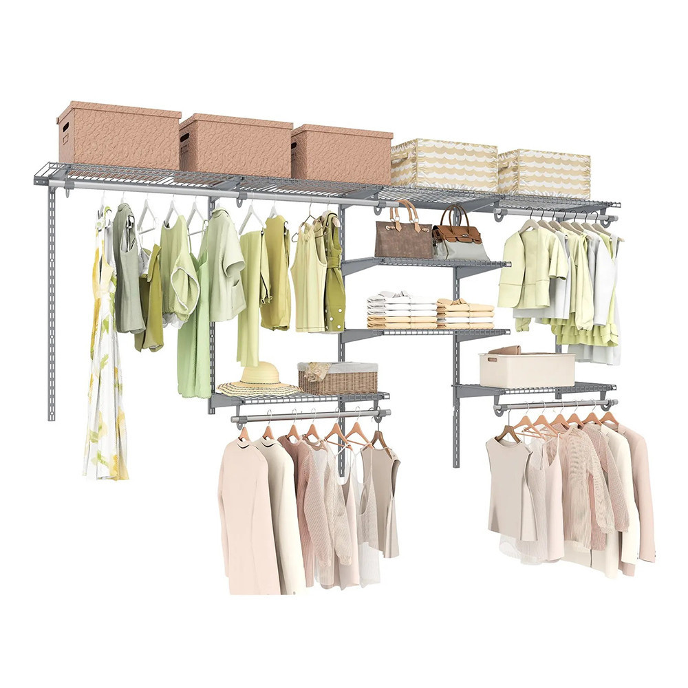 Zestaw zawiera 7 półek i 5 drążków do wieszania, oferując łącznie do 380 cm przestrzeni do wieszania i 548 cm powierzchni półkowej. Idealnie nadaje się do organizacji ubrań, toreb, kapeluszy, butów lub innych akcesoriów, pomagając utrzymać porządek w szafie.