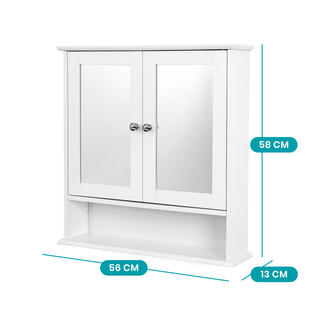 Dwoje lustrzanych drzwi idealnie sprawdza się przy codziennym makijażu lub goleniu – bez potrzeby dodatkowego lustra. Wewnątrz znajduje się miejsce na najważniejsze kosmetyki i akcesoria.