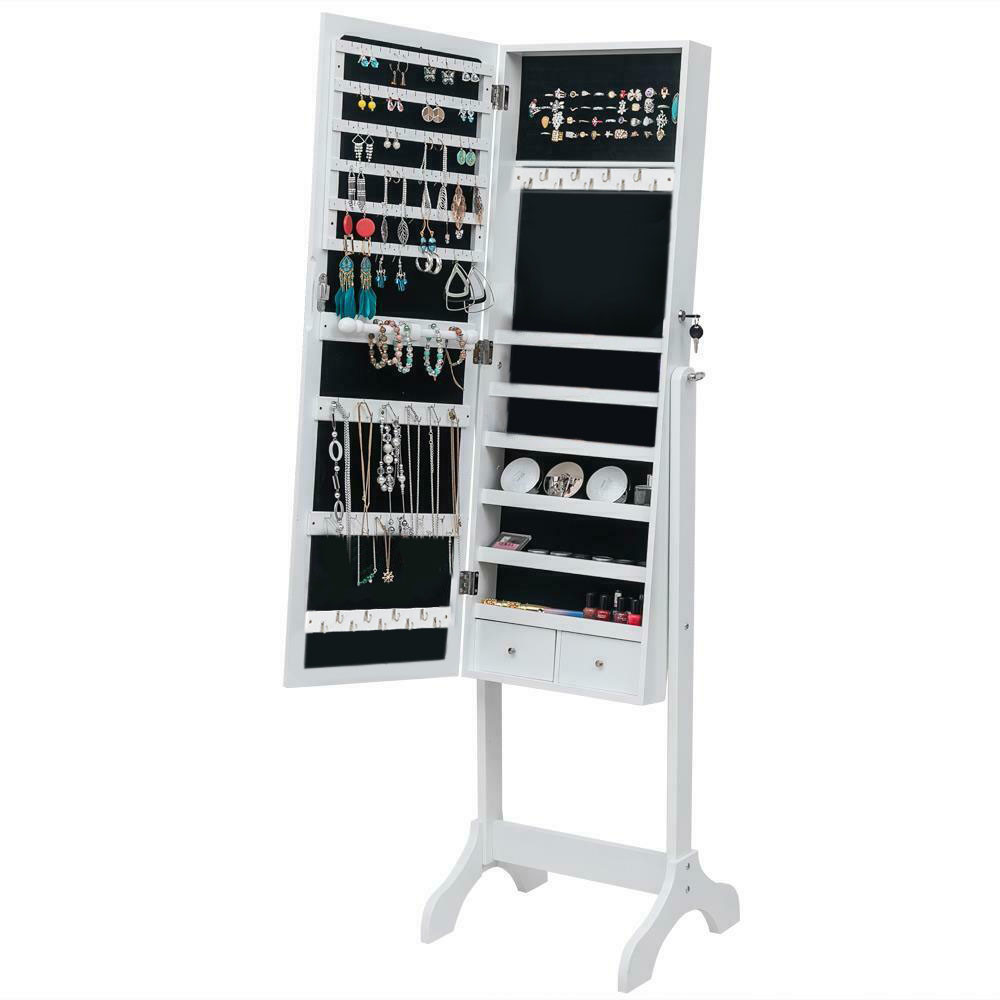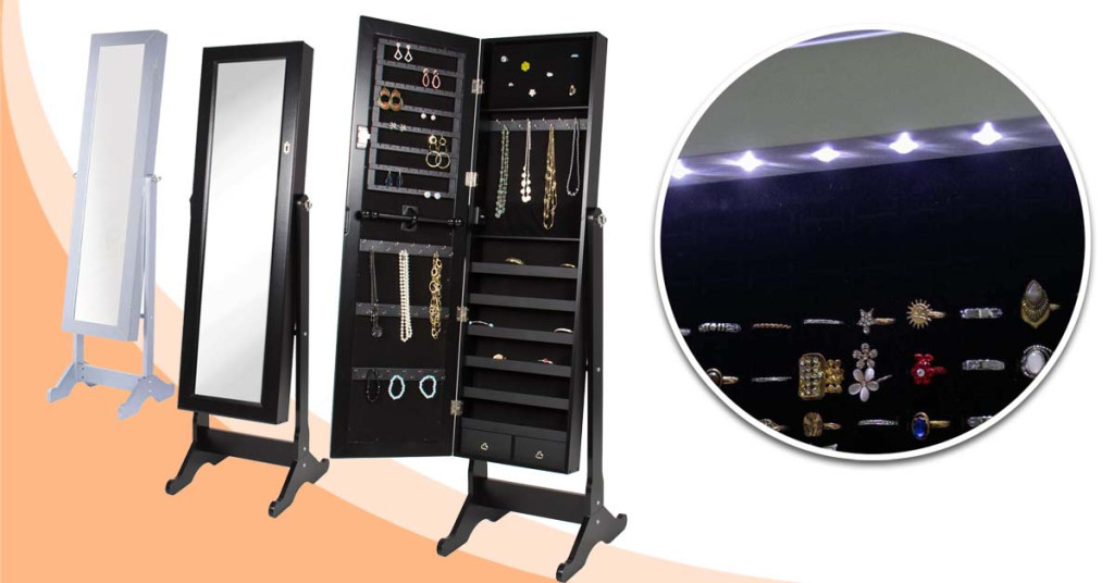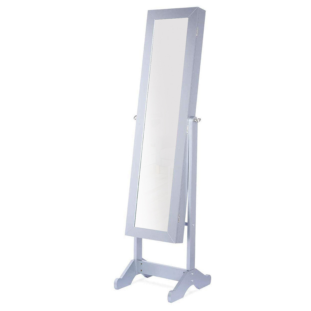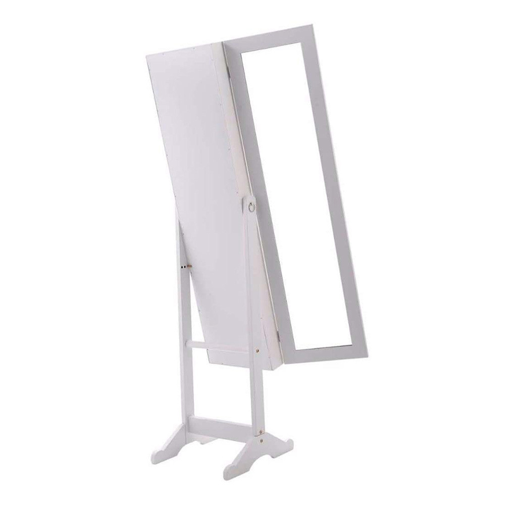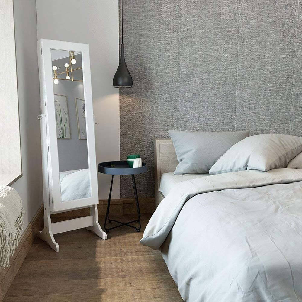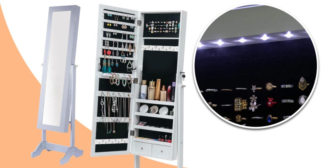 Wewnątrz szafy znajdują się 3 × 9 haczyków do zawieszania naszyjników oraz dedykowane przegródki na pierścionki, bransoletki i kolczyki. Miękka aksamitna wyściółka chroni biżuterię przed zarysowaniami i pozwala na wygodne uporządkowanie wszystkich akcesoriów.