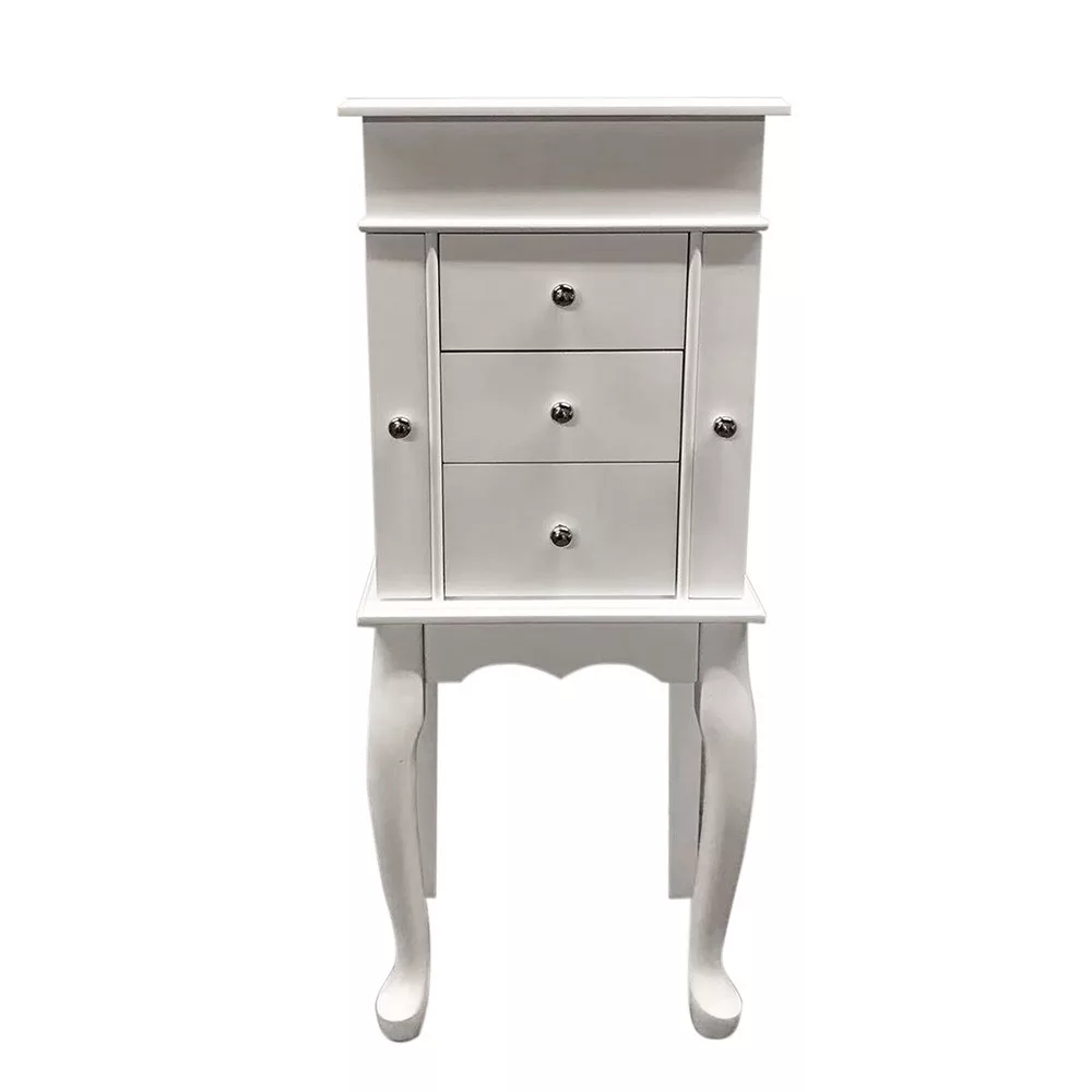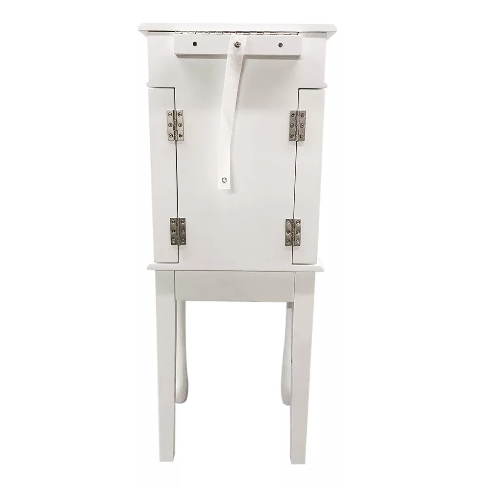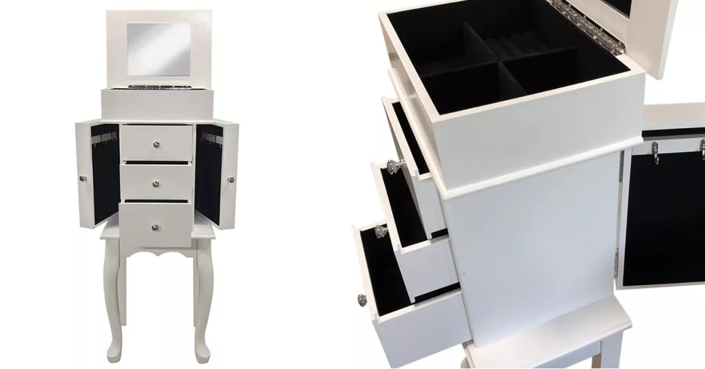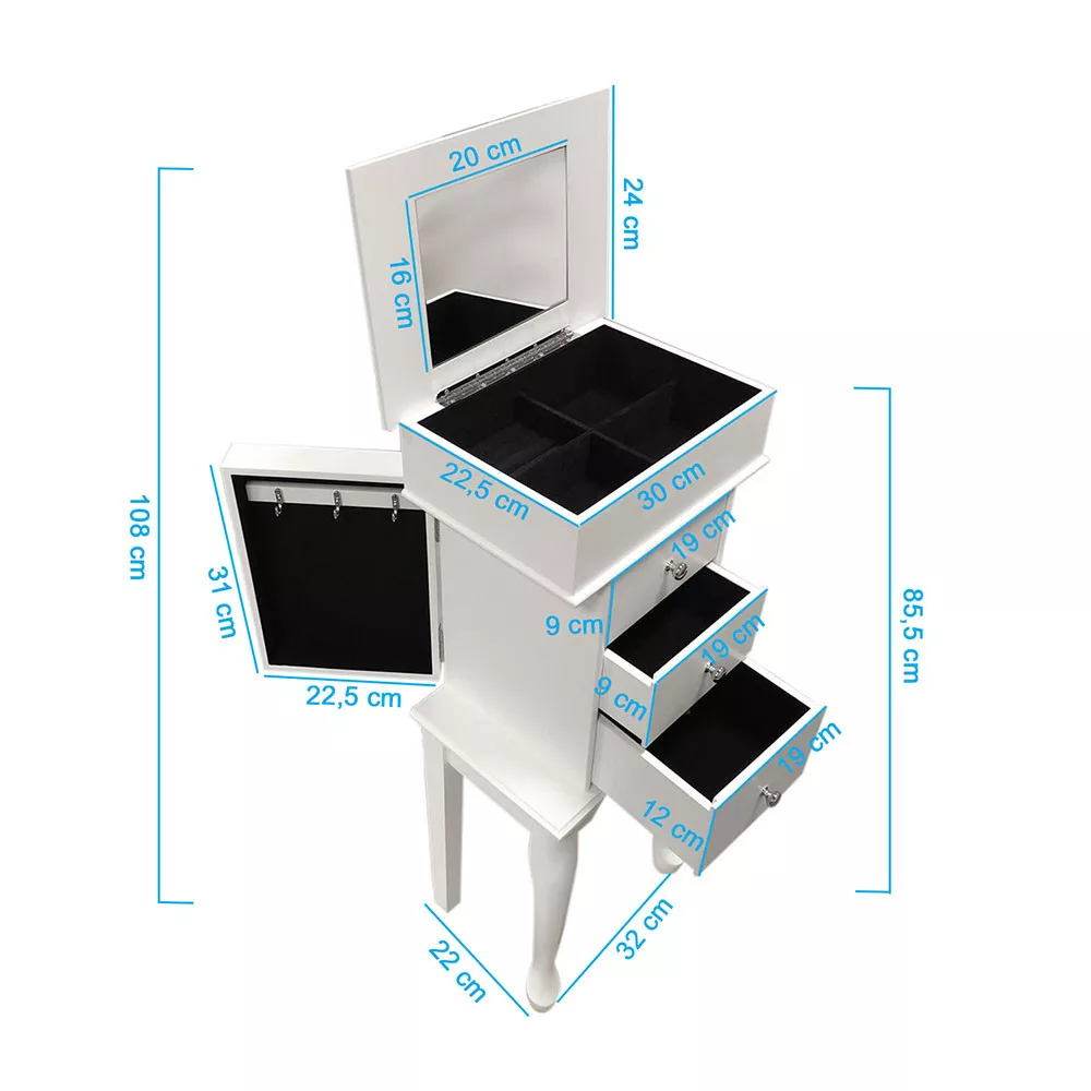 Solidna drewniana konstrukcja zapewnia trwałość, a czarna welurowa wyściółka chroni biżuterię przed zarysowaniami i uszkodzeniami. Klasyczny biały kolor pasuje do każdego wnętrza.