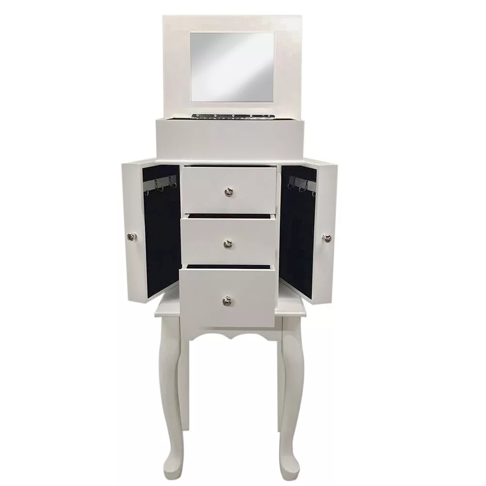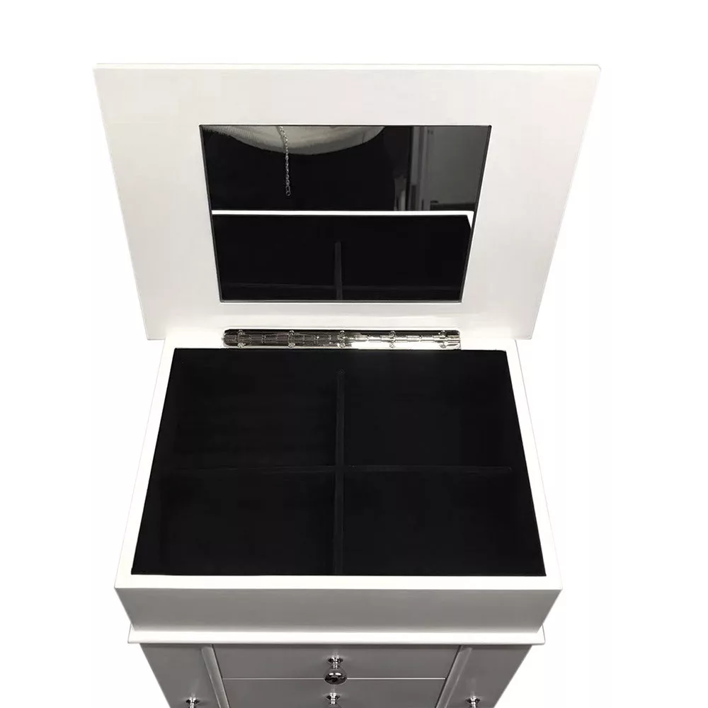 Górna część szafki zawiera lustro, które ułatwia przymierzanie biżuterii i codzienne przygotowania.