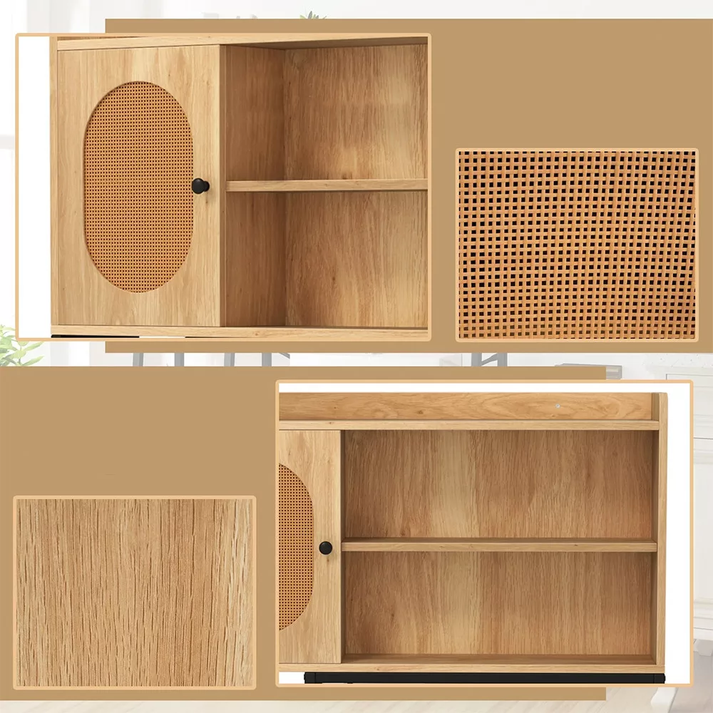 Drzwi z wstawką z rattanu PE oraz powierzchnia w efekcie drewna tworzą ciepłą, inspirowaną naturą atmosferę. Design dobrze pasuje zarówno do nowoczesnych, jak i klasycznych łazienek.