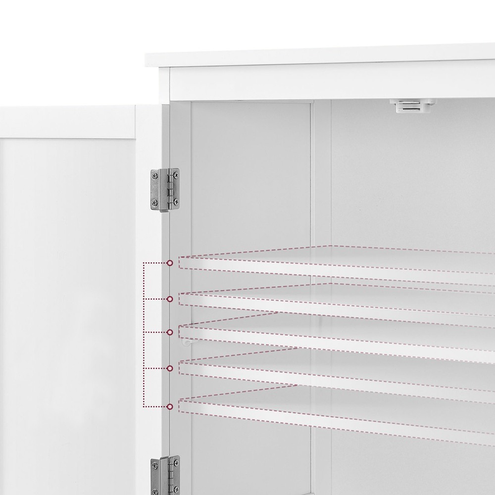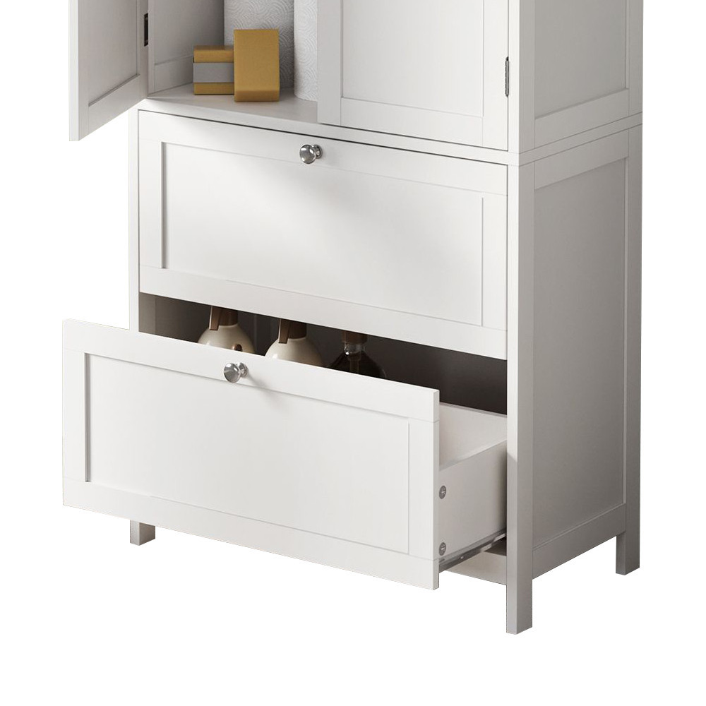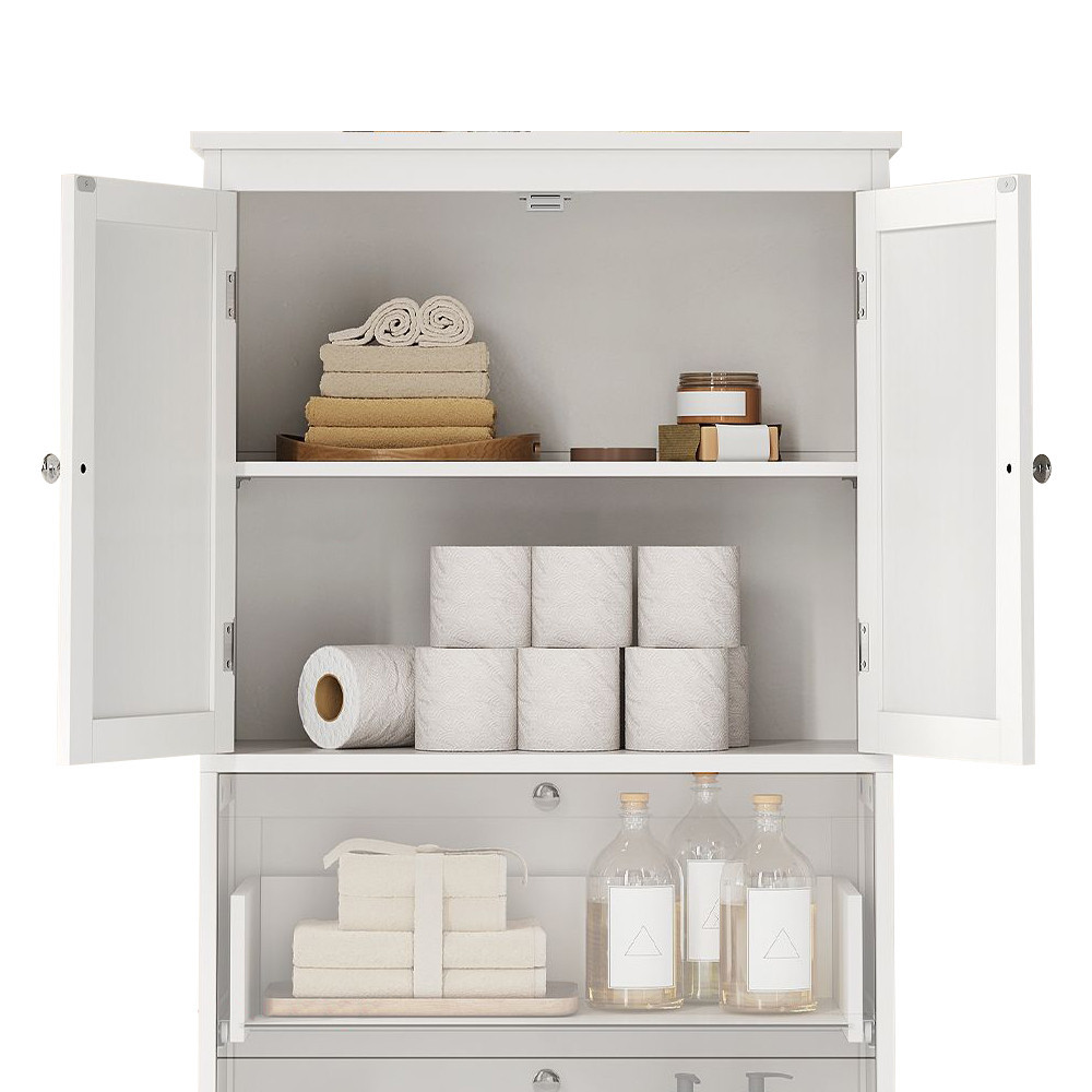 Biały kolor, ozdobne panele drzwi i prosta forma dodają elegancji przestrzeni, łatwo dopasowując się do każdej aranżacji łazienki.