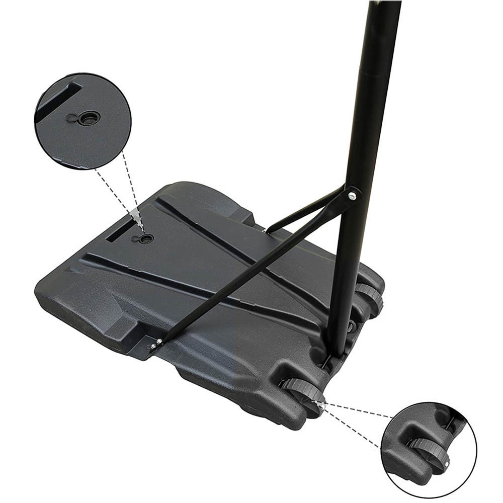 Solidny metalowy słup i podstawa, którą można wypełnić wodą lub piaskiem, zapewniają stabilność nawet podczas intensywnej gry. Podstawa wyposażona w dwa kółka jest łatwa do przesuwania, dzięki czemu kosz można szybko przenieść w inne miejsce. Wytrzymała tablica z tworzywa sztucznego i nylonowa siatka są odporne na warunki atmosferyczne, co sprawia, że kosz nadaje się zarówno do użytku wewnętrznego, jak i zewnętrznego.