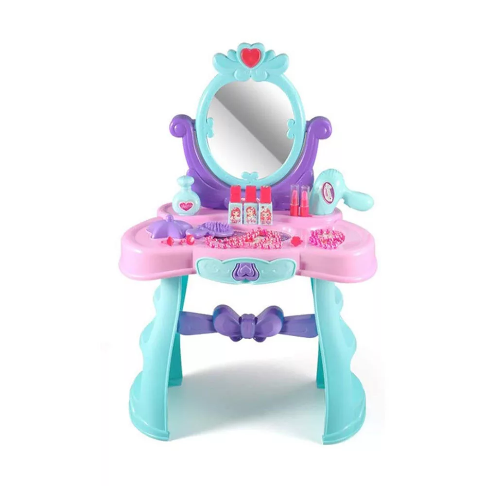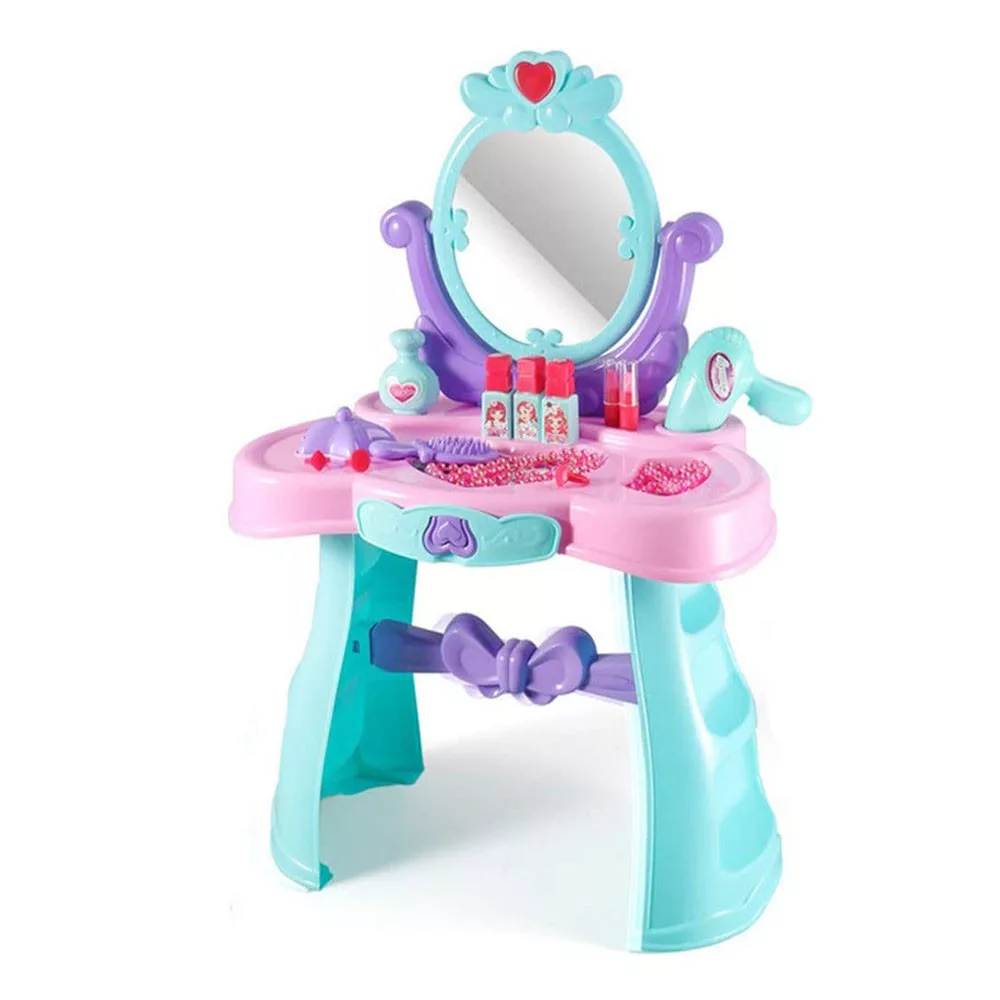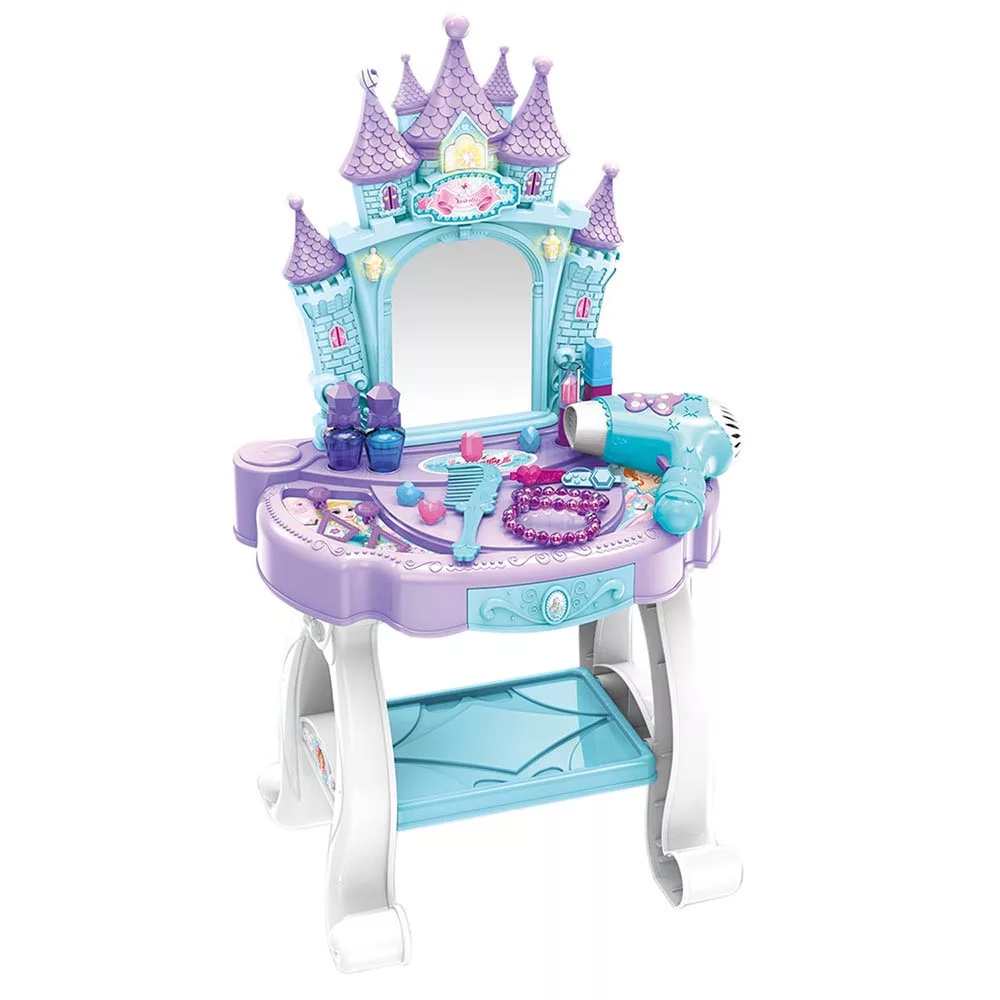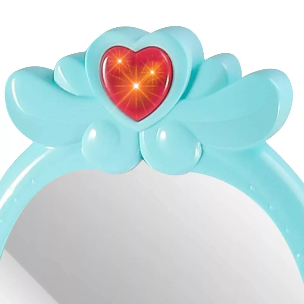 Zaokrąglone krawędzie sprawiają, że zabawa jest całkowicie bezpieczna. Lustro z możliwością regulacji pod kątem 180 stopni pozwala łatwo sprawdzić fryzurę lub makijaż. Wbudowany odtwarzacz muzyczny i świecące przyciski dodają zabawie wyjątkowego uroku, tworząc atmosferę prawdziwego królewskiego salonu.