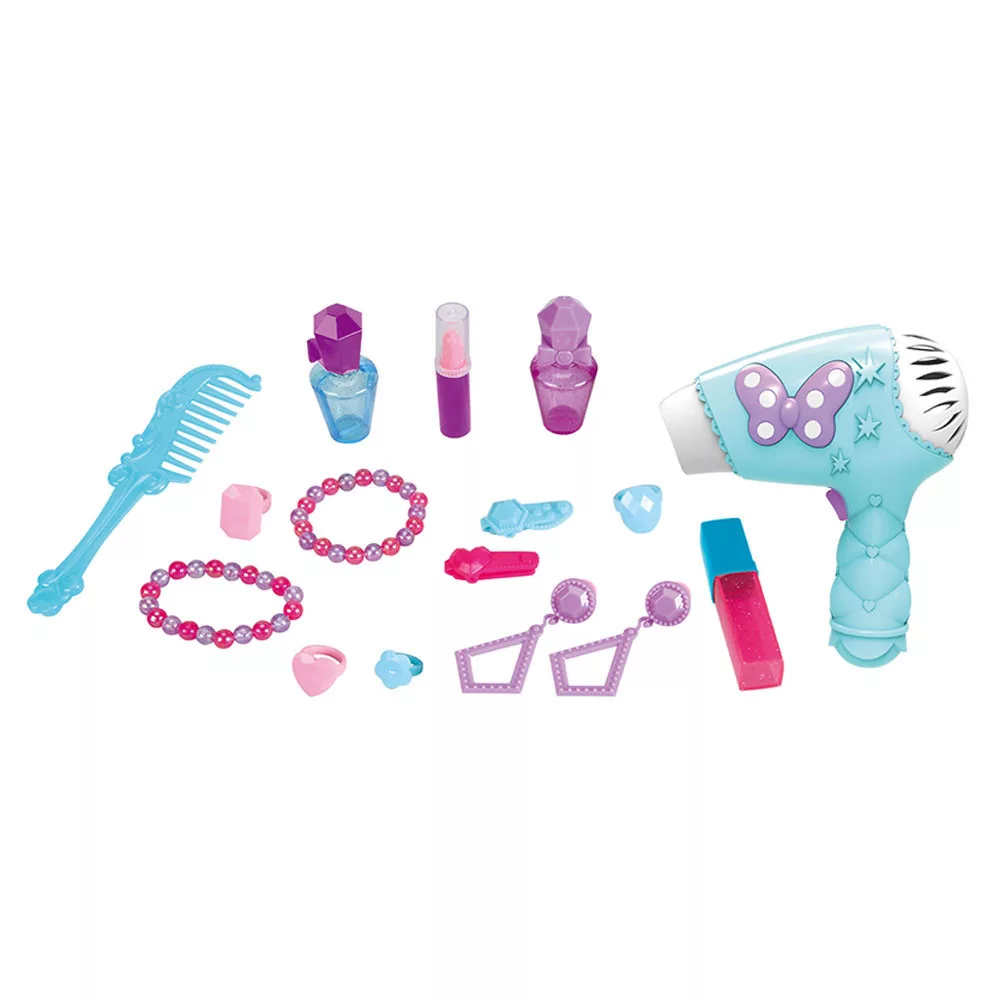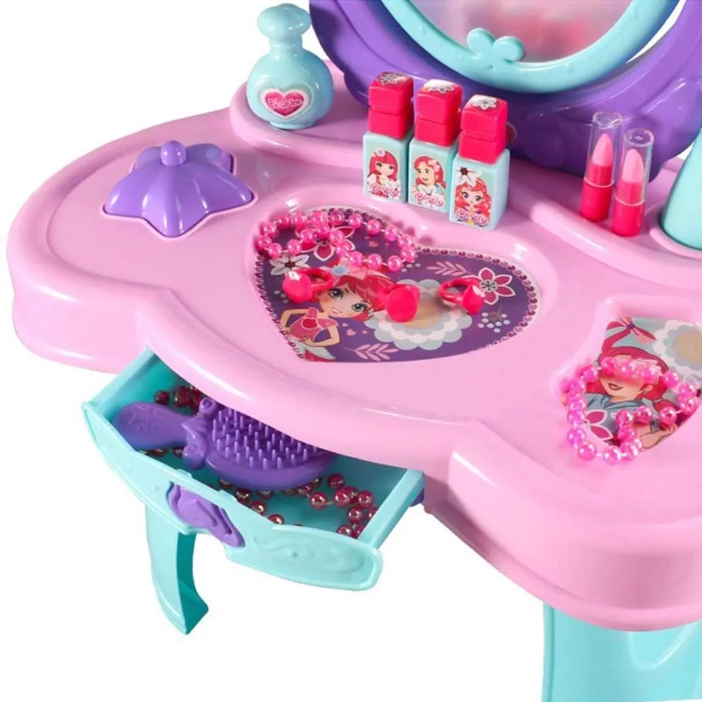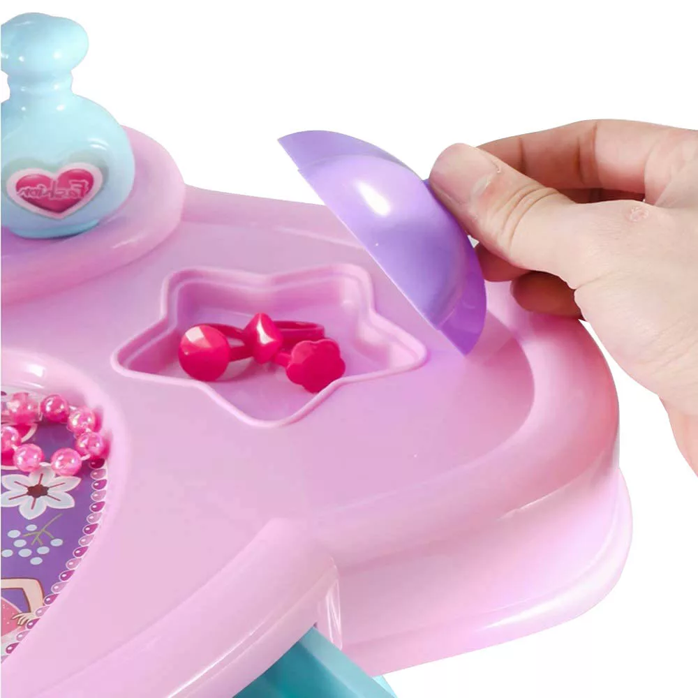 Toaletka wyposażona jest w schowki i szuflady, które pomagają utrzymać porządek i sprawiają, że wszystkie akcesoria są zawsze pod ręką. W zestawie znajdują się również biżuteria i akcesoria kosmetyczne – takie jak bransoletki, naszyjniki, pierścionki oraz flakonik na perfumy – które dodają zabawie jeszcze więcej magii.