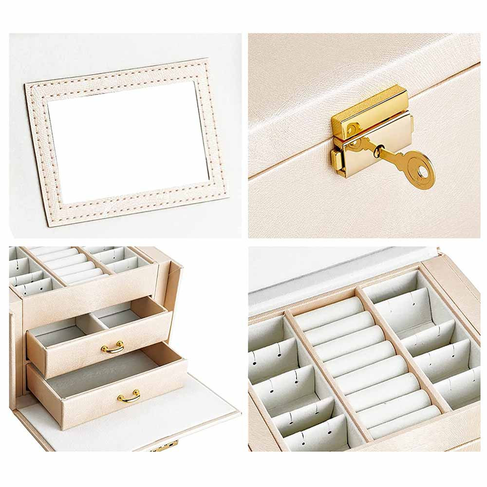 Szkatułka posiada dwie wysuwane szufladki, wałeczki na pierścionki oraz wiele małych przegródek, dzięki czemu każda biżuteria znajdzie swoje miejsce. Pokrywa wyposażona w elegancki złoty zamek i kluczyk zapewnia dodatkowe bezpieczeństwo Twoim kosztownościom.