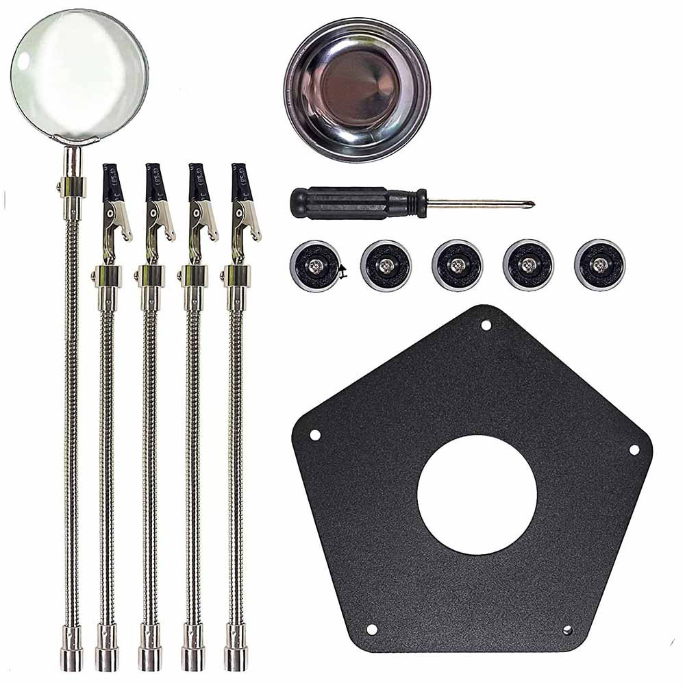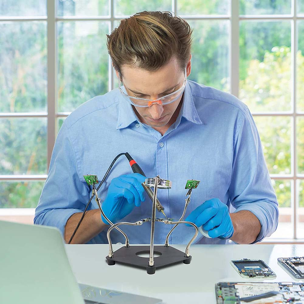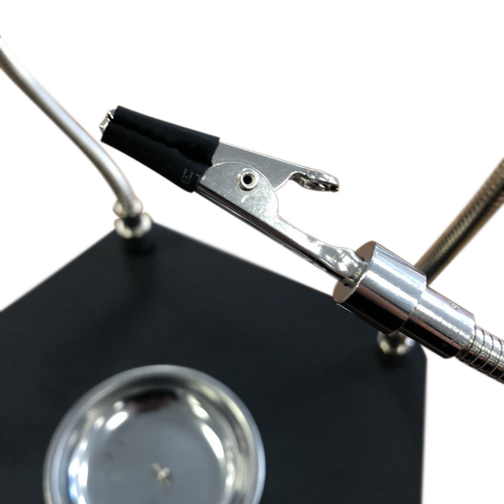 Uchwyt do płytek PCB wyposażony w zaciskowe ramiona stabilnie trzyma płytki podczas lutowania. Posiada 4 uchwyty z obracającymi się o 360° krokodylkami, które pozwalają na ustawienie idealnego kąta lutowania. Sprężynowe, elastyczne ramiona łatwo się zginają, zapewniając maksymalną przestrzeń do pracy.