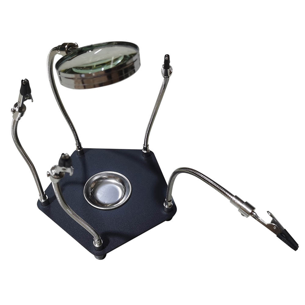 Dzięki antypoślizgowym nóżkom uchwyt stoi stabilnie. Środkowa taca na narzędzia i drobne elementy zapobiega ich zgubieniu. Idealny do lutowania obwodów, przewodów i innych elementów.