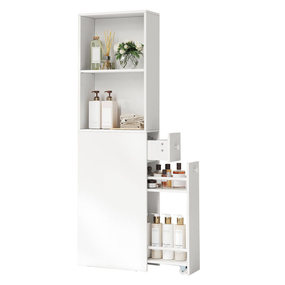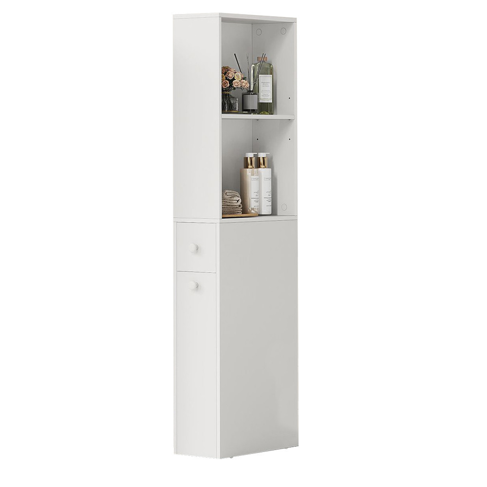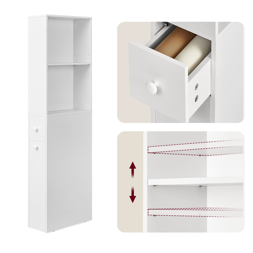 Wyposażona w dwie otwarte półki – z czego jedna jest regulowana – mniejszą szufladę oraz głębszą szufladę na dole, ta szafka pomaga utrzymać porządek w kosmetykach, papierze toaletowym, środkach czyszczących i innych akcesoriach.