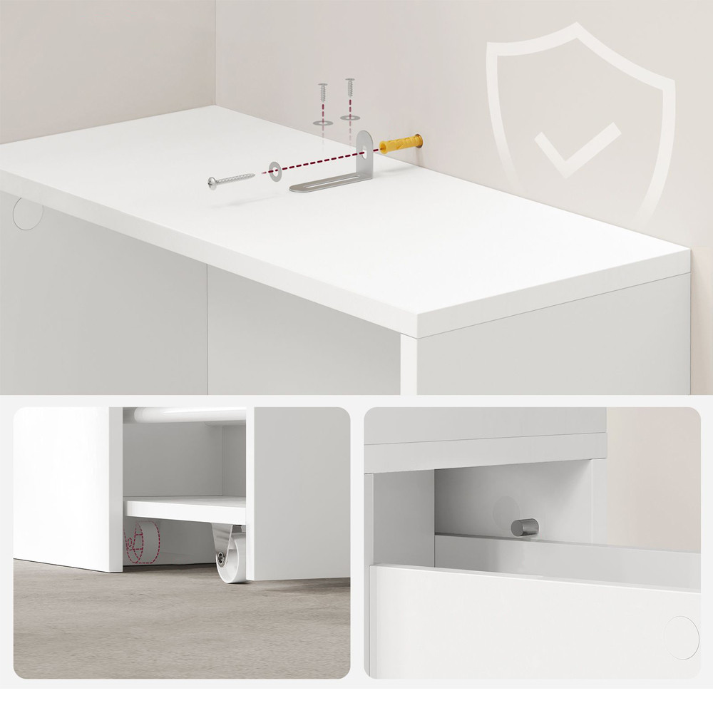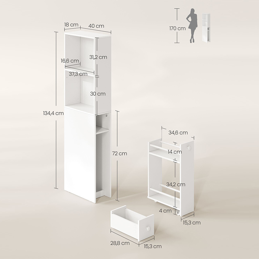 Wysokiej jakości konstrukcja z płyty wiórowej zapewnia trwałość i stabilność, a zestaw do mocowania zapobiega przewróceniu się, nawet na nierównych podłogach. Jej czysty, biały kolor doskonale pasuje do każdej nowoczesnej łazienki.