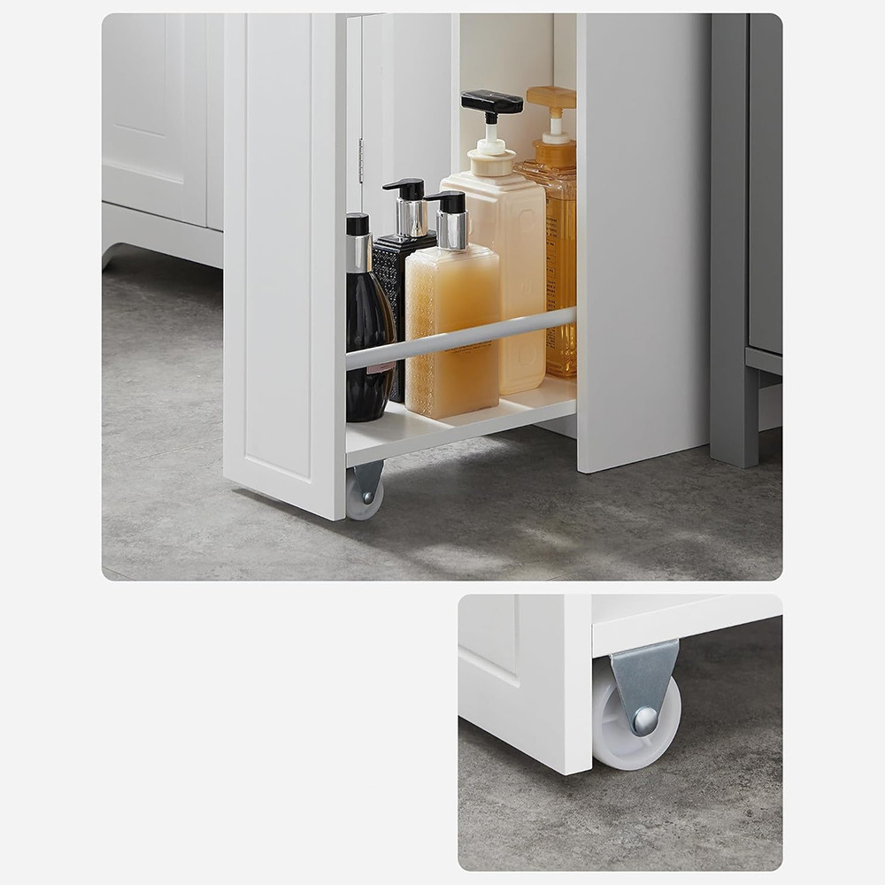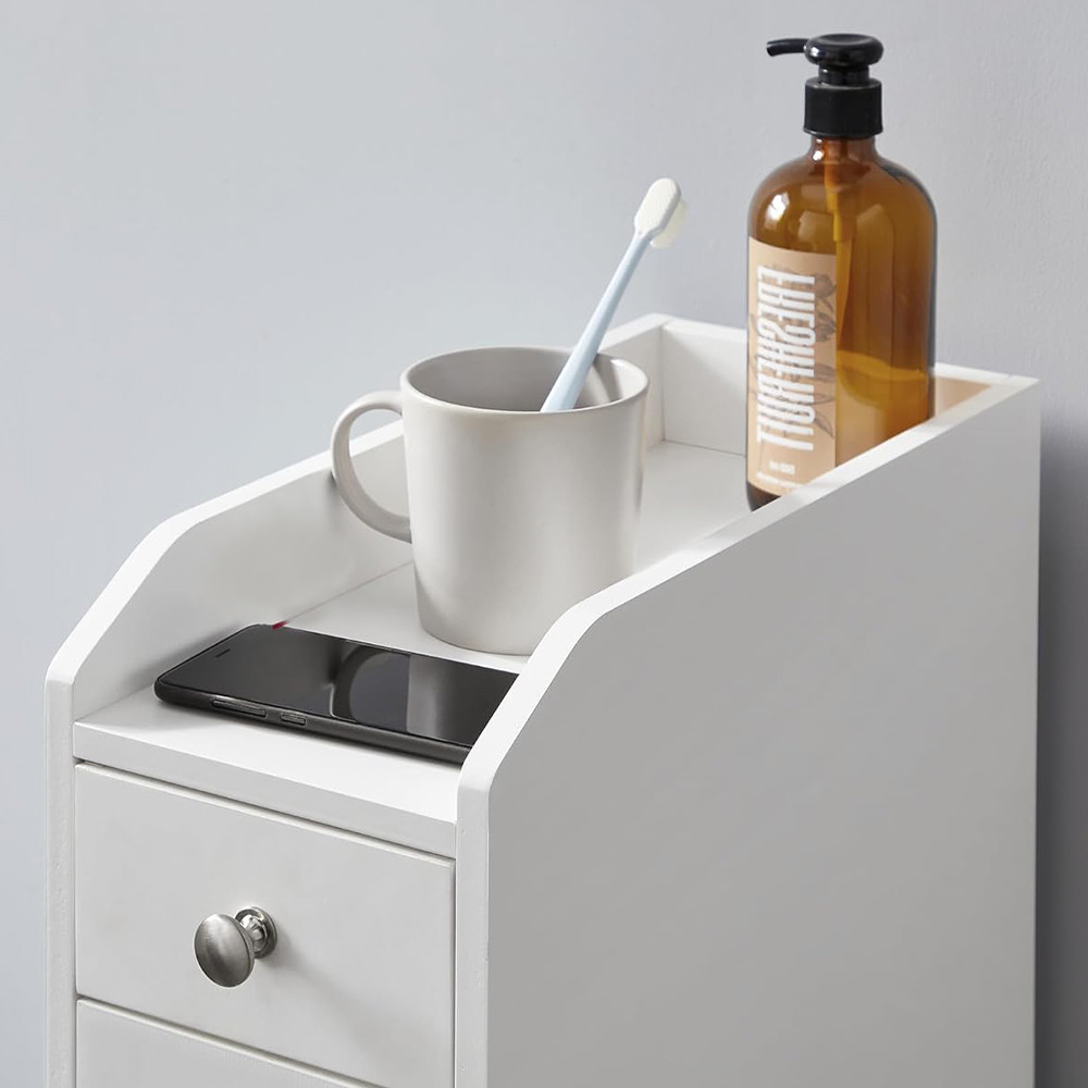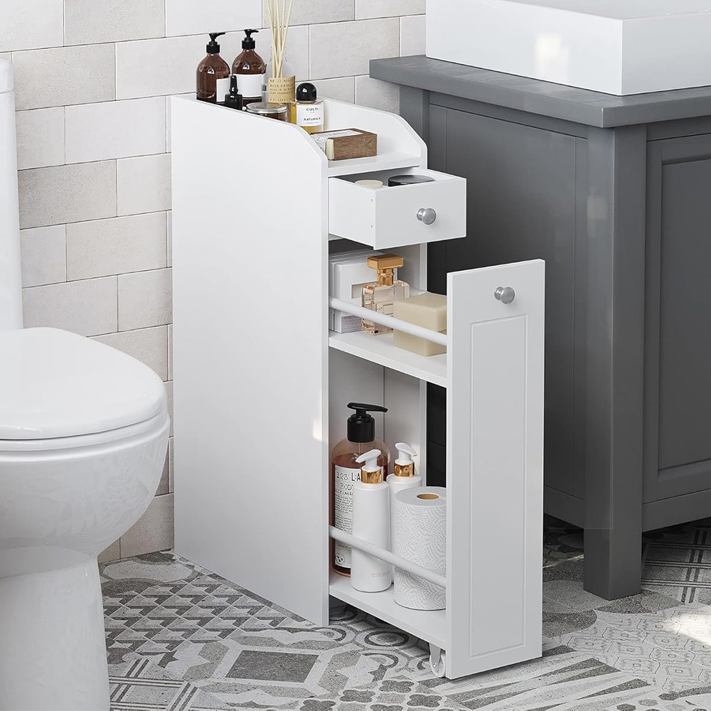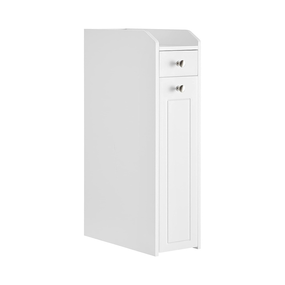 Ta wąska szafka to doskonały wybór do małych łazienek lub kuchni. Pomimo kompaktowych wymiarów oferuje dużo miejsca na codzienne akcesoria i kosmetyki.
