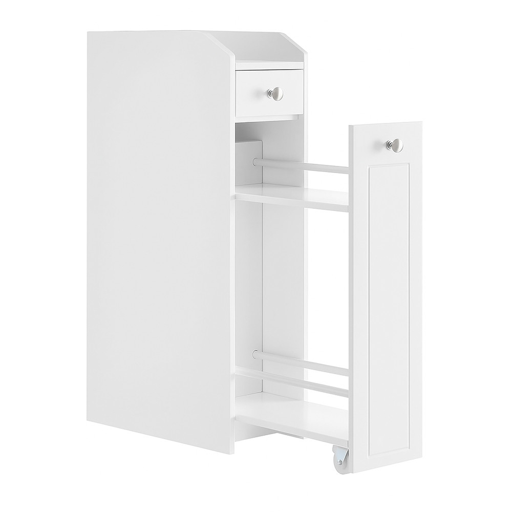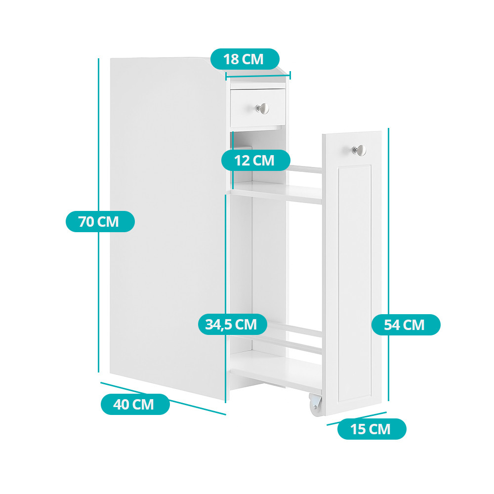 Wymiary 40 × 18 × 70 cm sprawiają, że szafka idealnie mieści się między toaletą a ścianą lub w wąskich wnękach kuchennych. Biały kolor pasuje do każdego wnętrza – nowoczesnego i klasycznego.