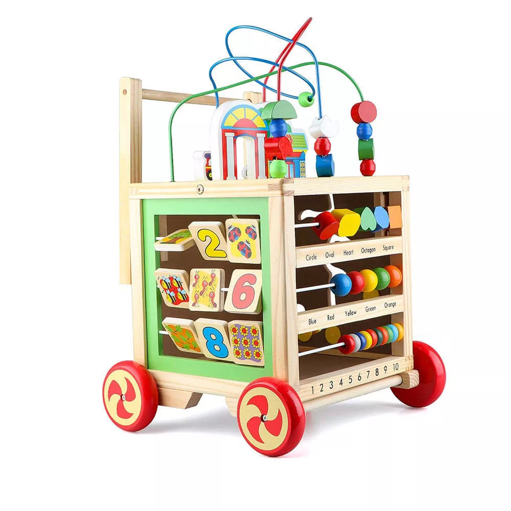 Wielofunkcyjny drewniany pchacz to idealny towarzysz dla maluchów uczących się chodzić. Stabilna konstrukcja zapewnia wsparcie, a wbudowane zabawki edukacyjne przyciągają uwagę i wspierają rozwój zdolności manualnych.
