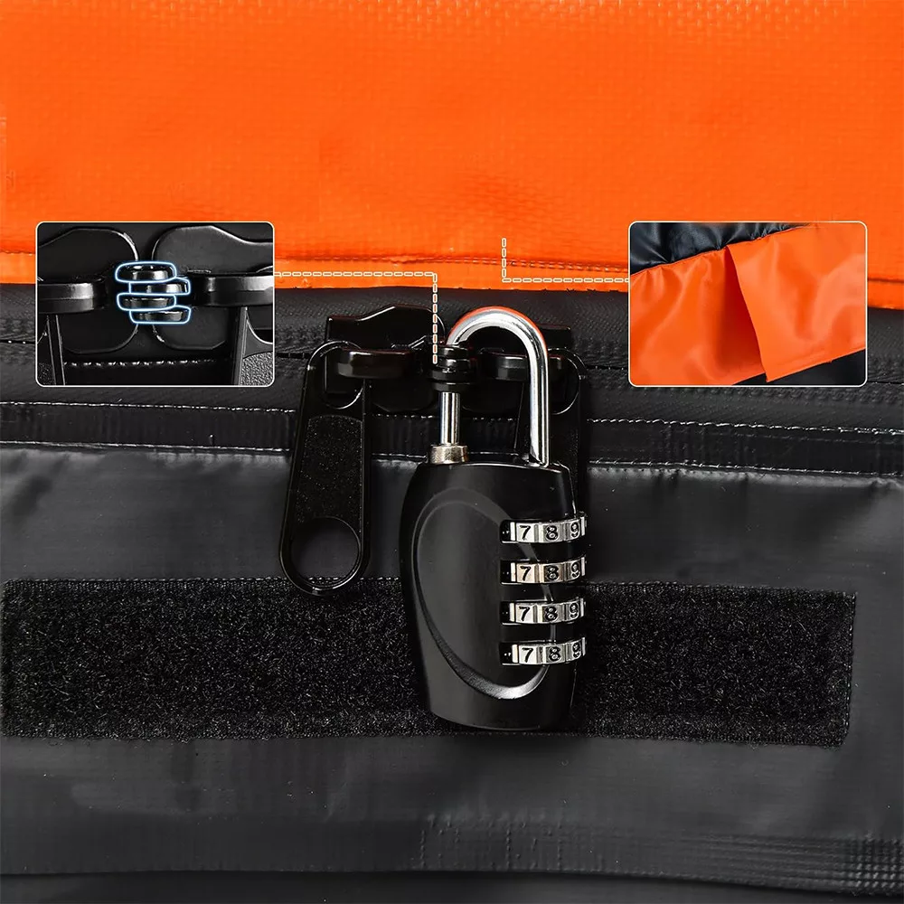 Wykonana z trójwarstwowego, wysokodensyjnego materiału PVC, jest odporna na wodę, kurz i promieniowanie UV. 11 cm pokrowiec przeciwdeszczowy z rzepem zapobiega przedostawaniu się wody przez zamek, chroniąc zawartość przed deszczem, śniegiem i wiatrem. 4-cyfrowy zamek szyfrowy zapewnia dodatkowe bezpieczeństwo.