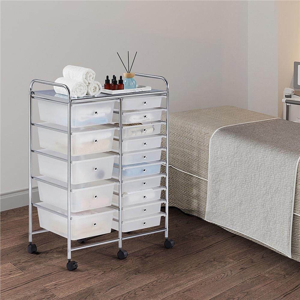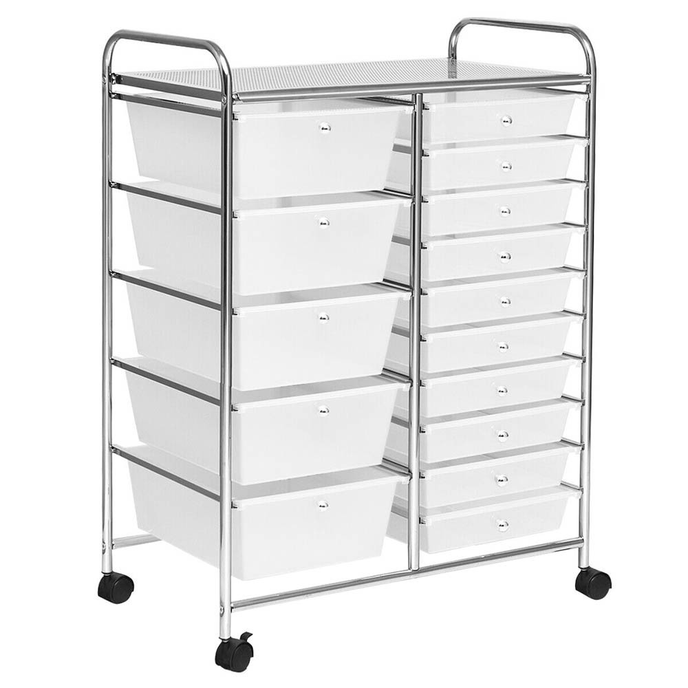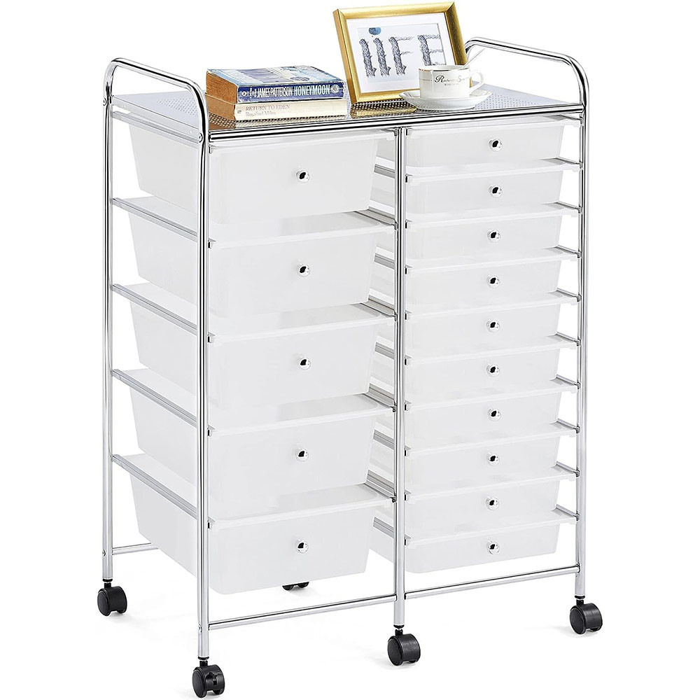 Wózek posiada łącznie 15 szuflad, które umożliwiają segregację przedmiotów według kategorii. Mniejsze szuflady doskonale sprawdzą się do przechowywania drobnych akcesoriów, artykułów biurowych czy kosmetyków, natomiast większe szuflady pomieszczą większe przedmioty, zapewniając maksymalną organizację.