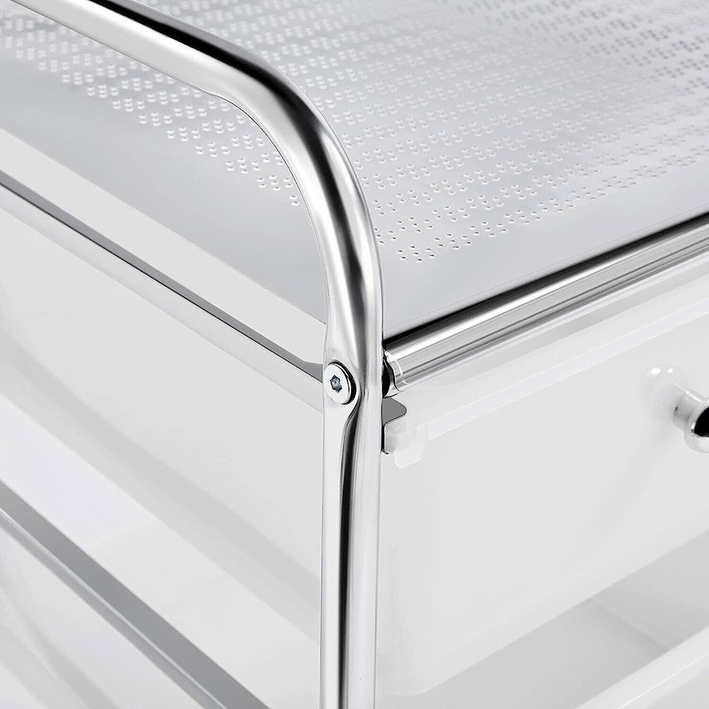 Chromowana rama i minimalistyczny wygląd sprawiają, że wózek świetnie wpasowuje się w każde wnętrze. Doskonale sprawdzi się w domowym biurze, przy toaletce czy w salonie kosmetycznym, oferując zarówno funkcjonalność, jak i estetyczny wygląd.