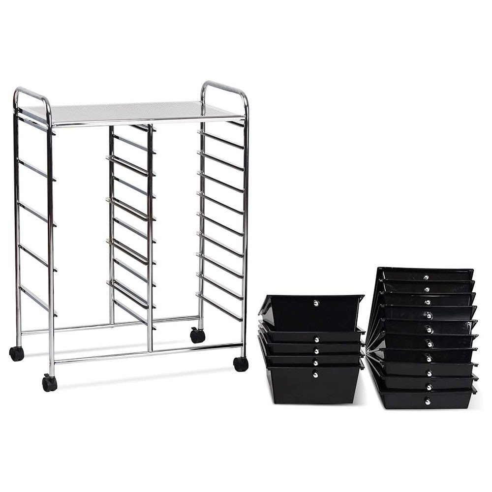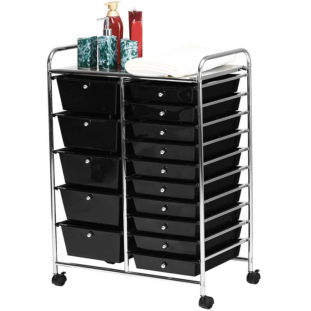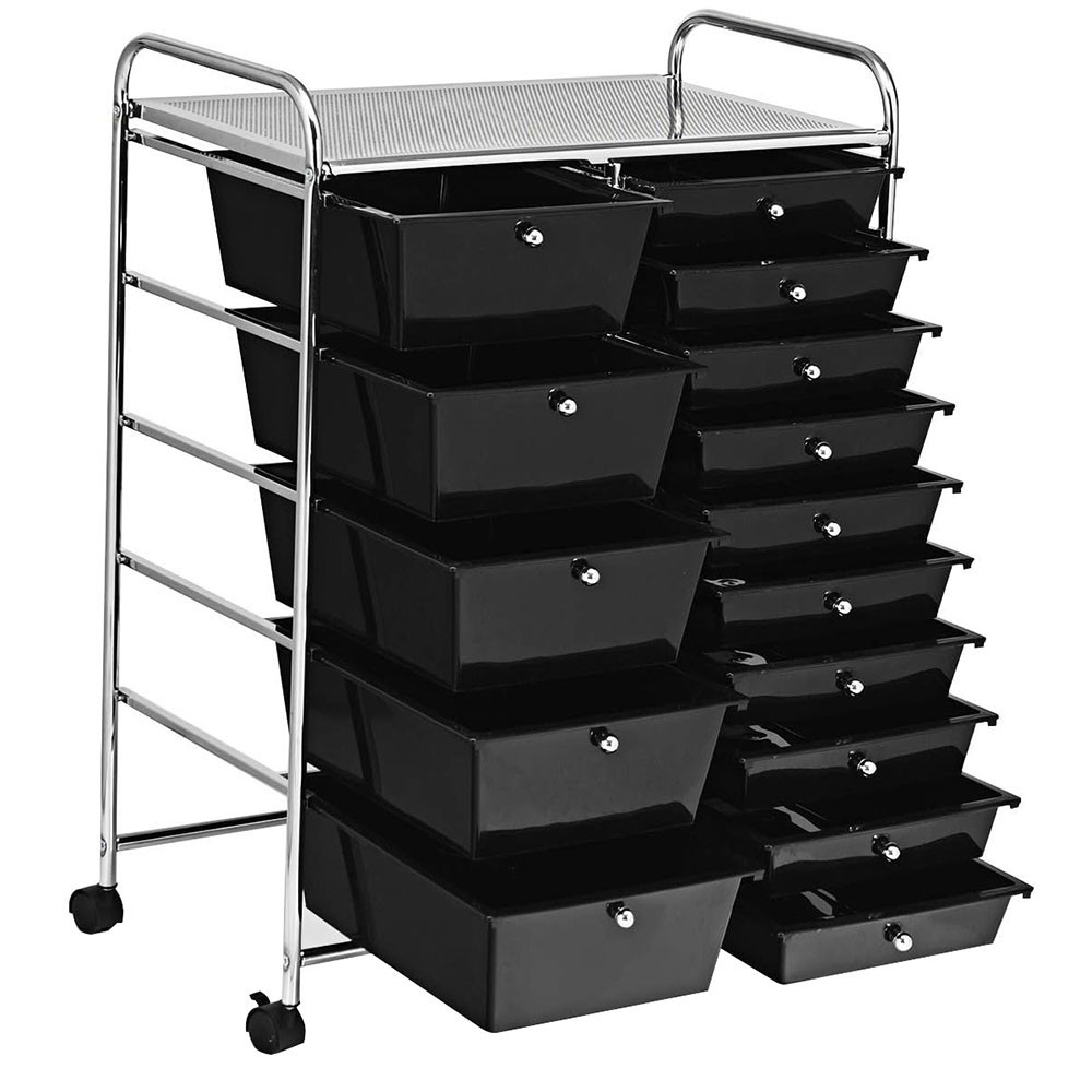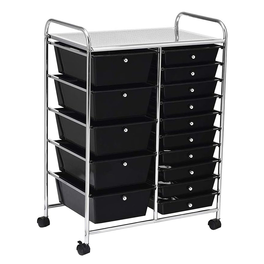 Wózek posiada łącznie 15 szuflad, które umożliwiają segregację przedmiotów według kategorii. Mniejsze szuflady doskonale sprawdzą się do przechowywania drobnych akcesoriów, artykułów biurowych czy kosmetyków, natomiast większe szuflady pomieszczą większe przedmioty, zapewniając maksymalną organizację.