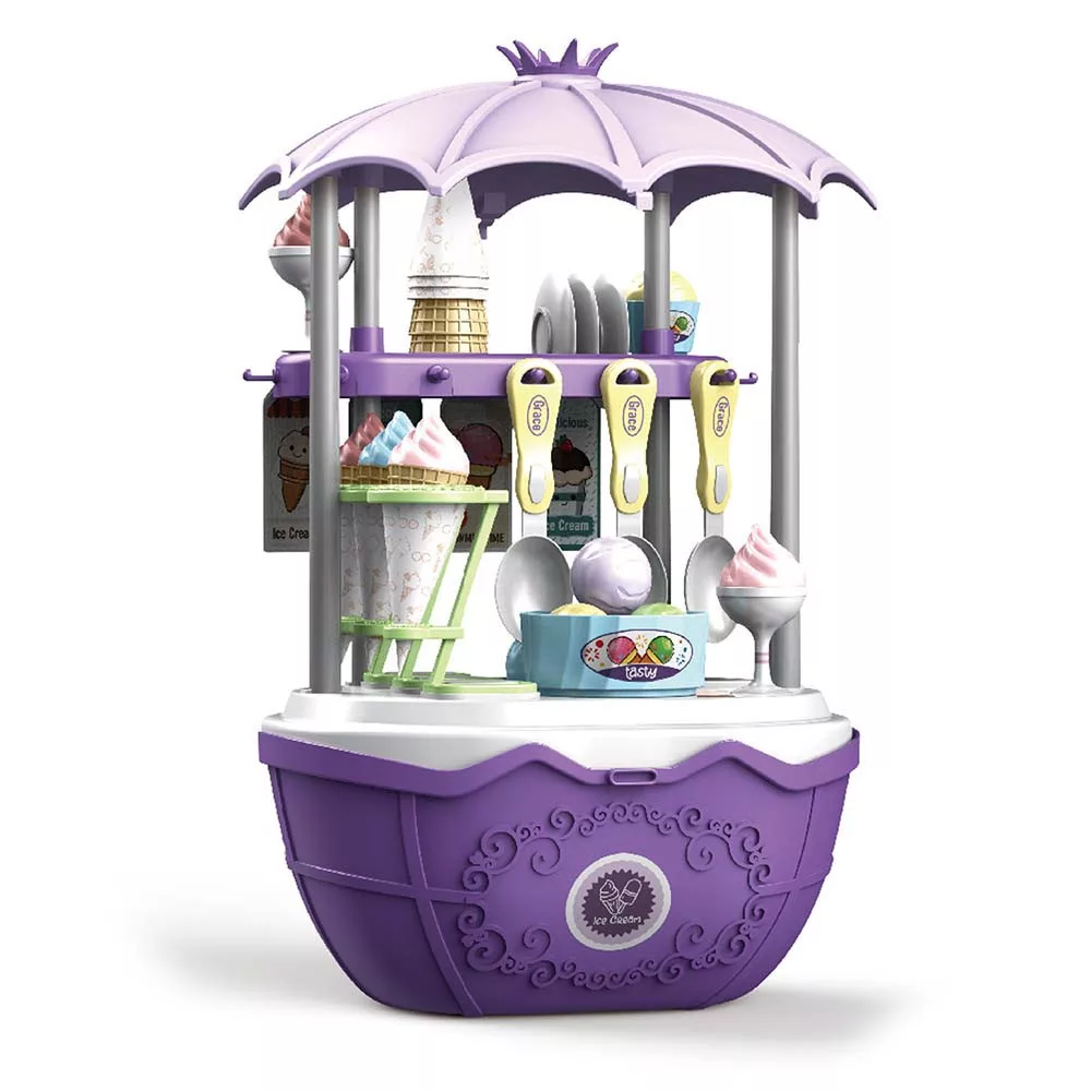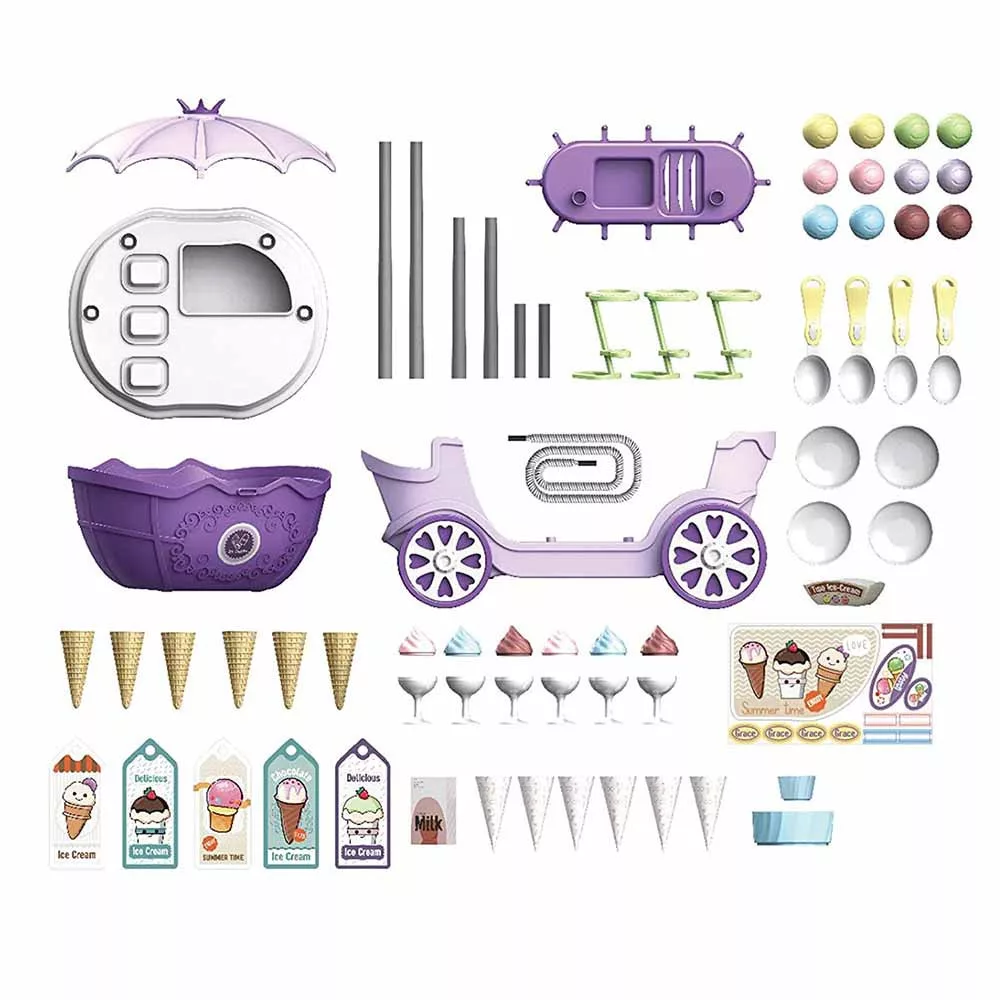 Kolorowe, realistyczne akcesoria – takie jak kulki lodowe, rożki, talerzyki i łyżeczki – umożliwiają bogatą zabawę w odgrywanie ról. Dzięki nim dzieci mogą wcielać się w rolę sprzedawców lodów, rozwijając swoją kreatywność i umiejętności społeczne.