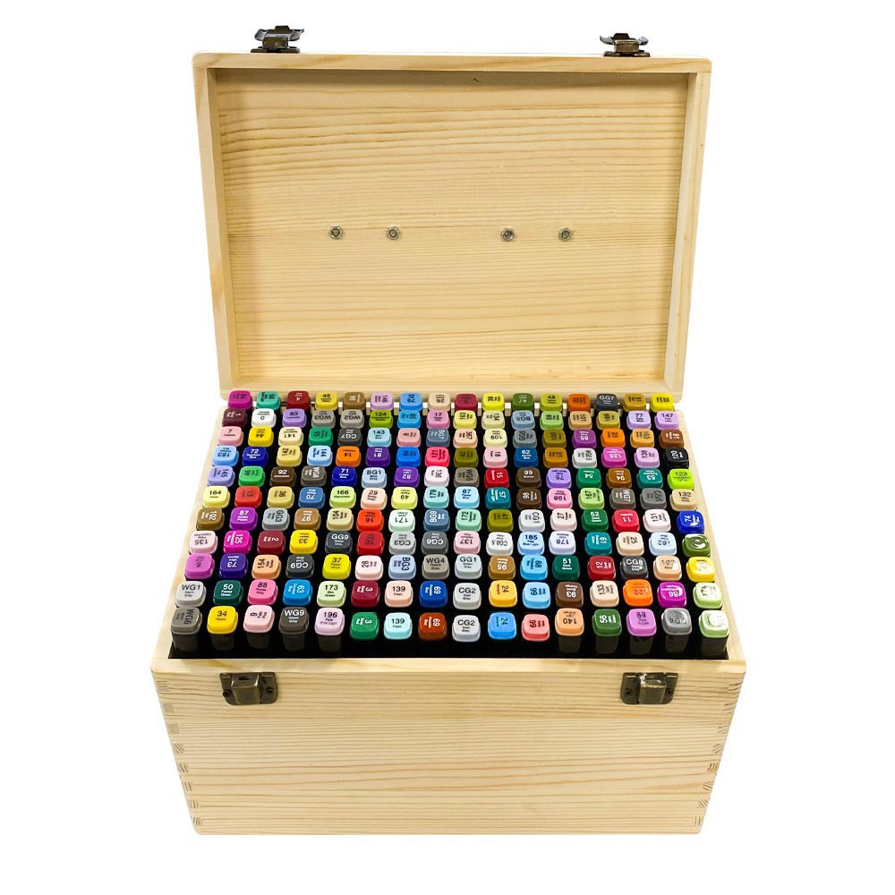 Drewniane pudełko jest wytrzymałe i łatwe do przenoszenia, dzięki czemu markery pozostają uporządkowane i zabezpieczone. Zamykana na metalowy zatrzask pokrywa oraz wygodny uchwyt zapewniają łatwy transport.