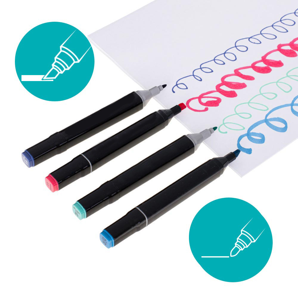 Markery posiadaja dwa rózne rozmiary koncówek. Grubsza koncówka, która zapewnia linie o grubosci do 5 mm, idealnie nadaje sie do wypelniania wiekszych powierzchni, kolorowania i cieniowania. Cienka koncówka, o maksymalnej grubosci linii 1 mm, sprawdza sie znakomicie przy obrysowywaniu i dopracowywaniu drobnych detali. Szybkoschnacy tusz zapobiega rozmazywaniu, a jednoczesnie umozliwia latwe mieszanie kolorów, dzieki czemu mozesz tworzyc wlasne, unikalne odcienie.