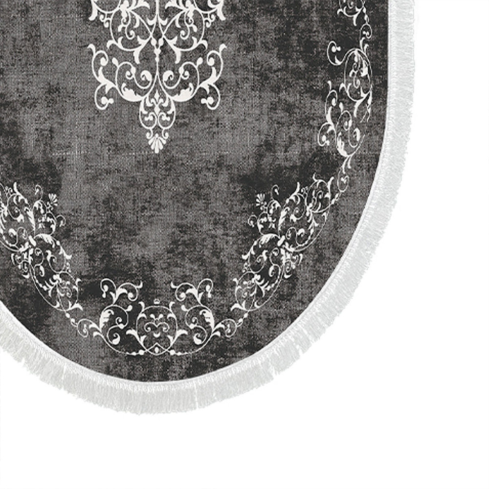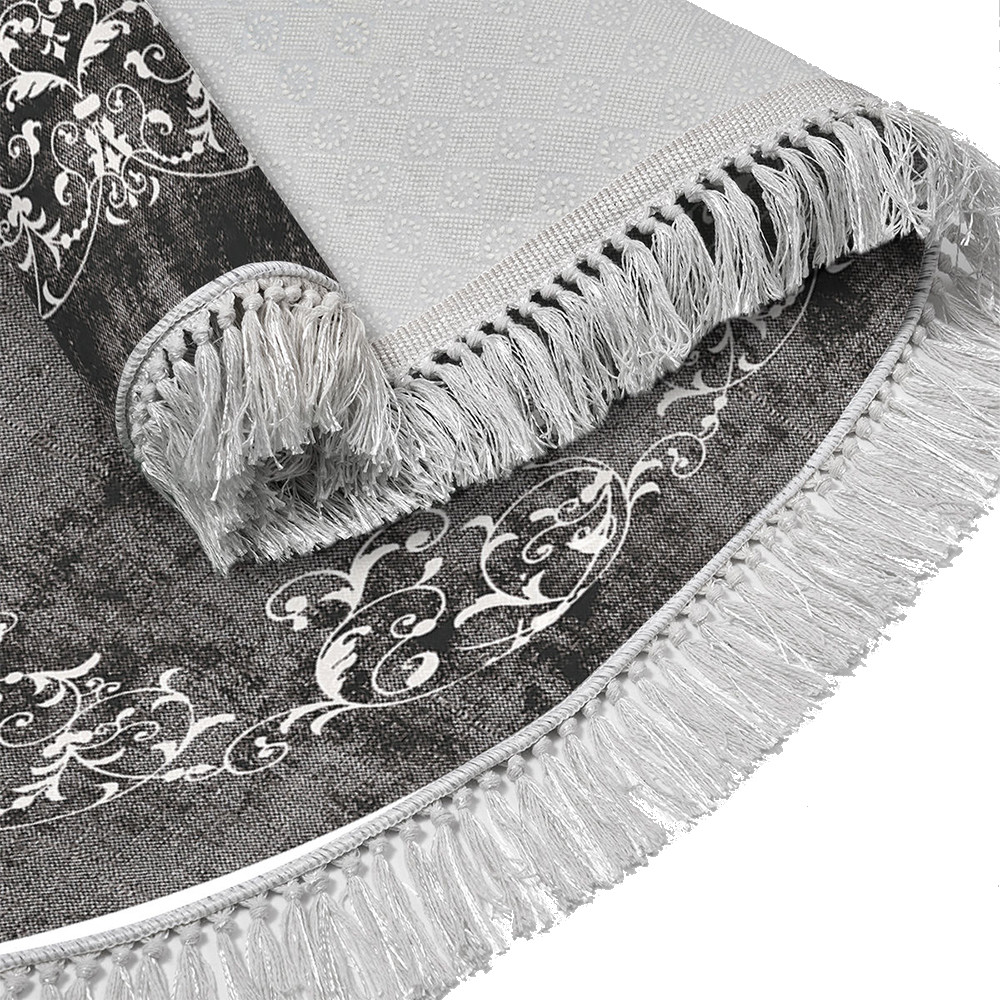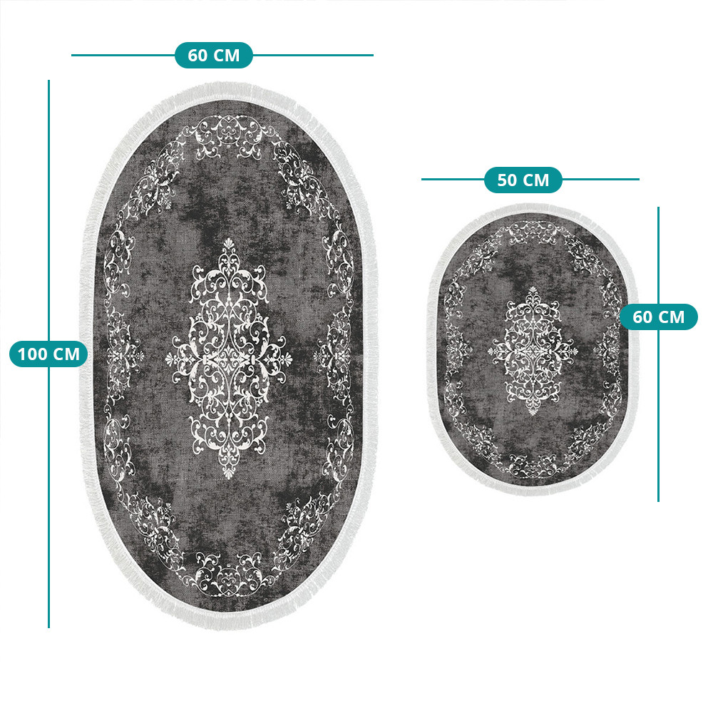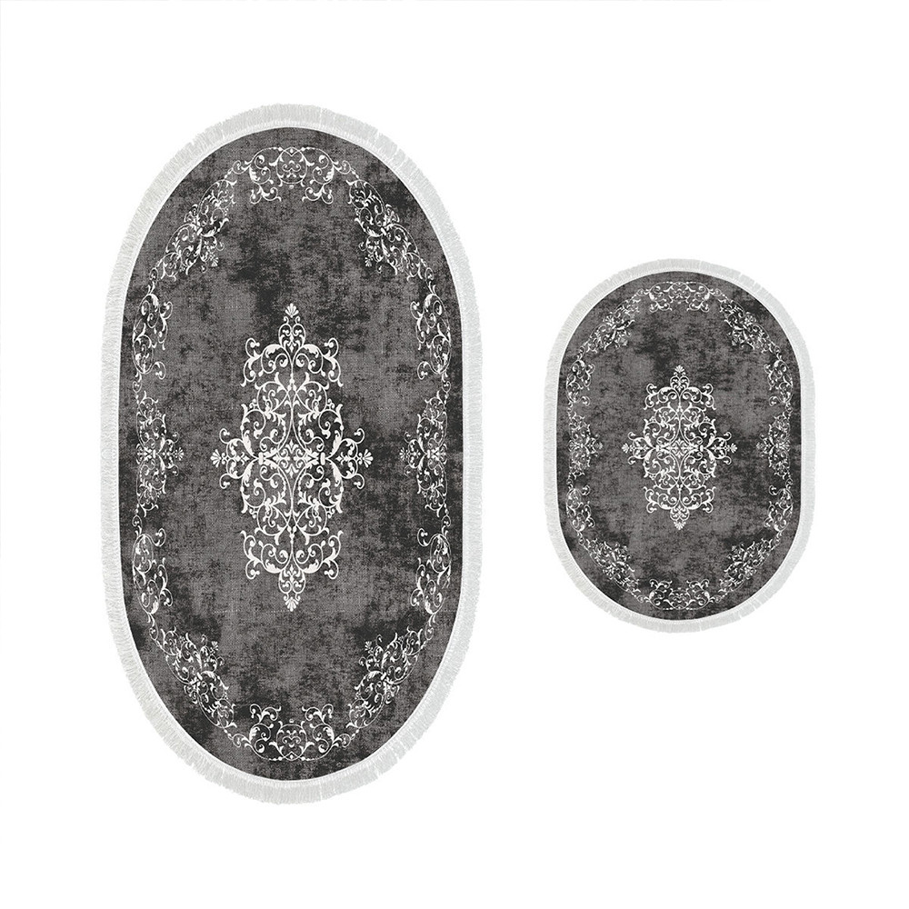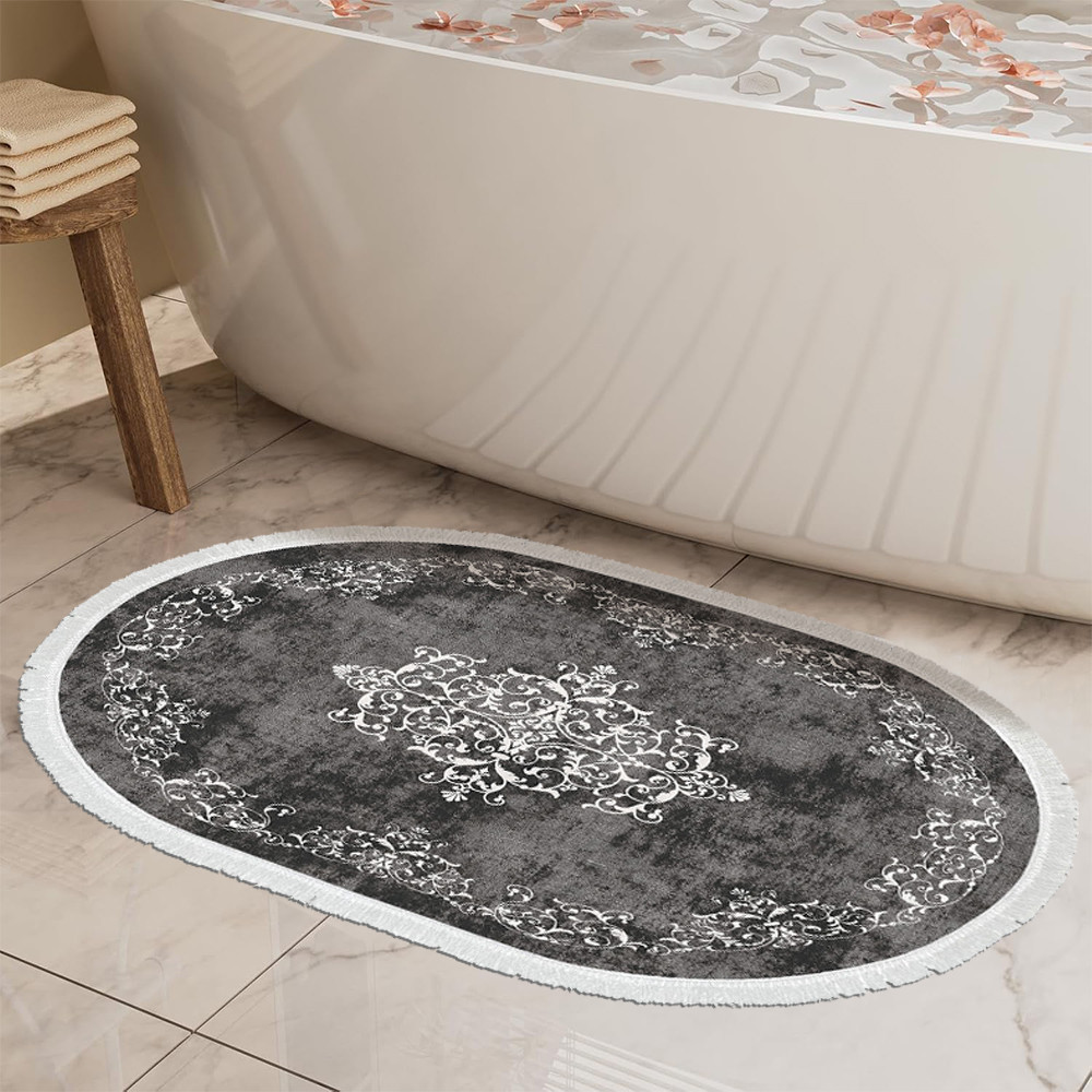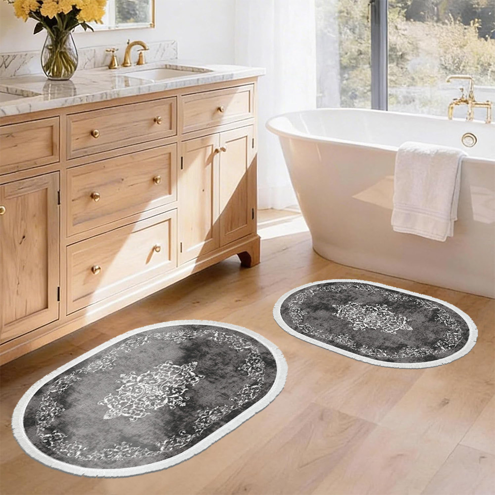 Szary odcień i klasyczny wzór tworzą harmonijną, spokojną atmosferę. Dwa dywaniki w różnych rozmiarach idealnie pasują przed umywalką oraz wanną lub prysznicem.