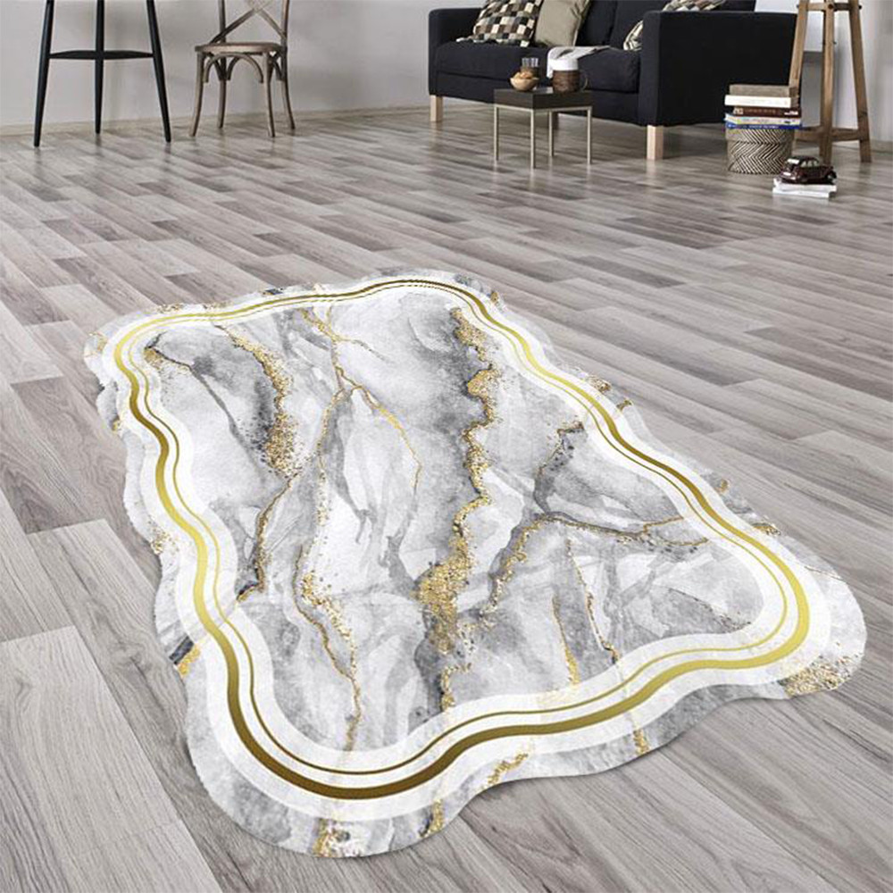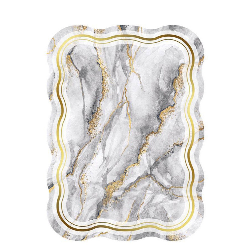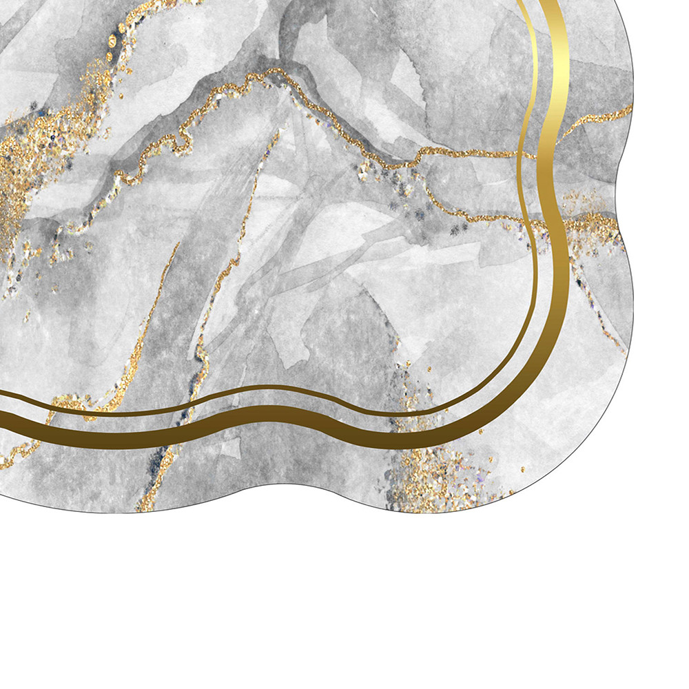 Szary wzór marmuru ze złotą obwódką tworzy ekskluzywną, nowoczesną atmosferę w łazience. Wysokość runa 10 mm zapewnia miękką i przyjemną w dotyku powierzchnię, dzięki czemu każdy krok daje komfort i uczucie ciepła.