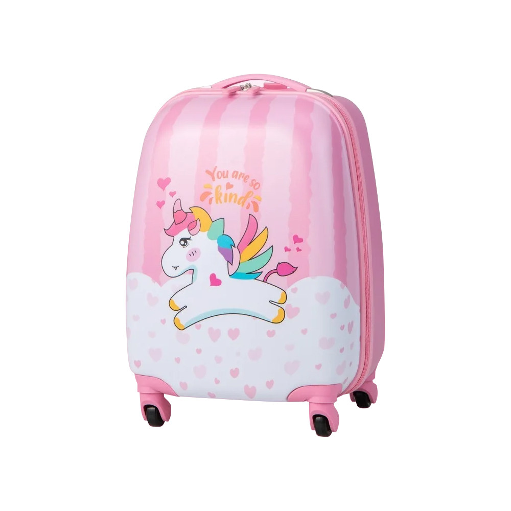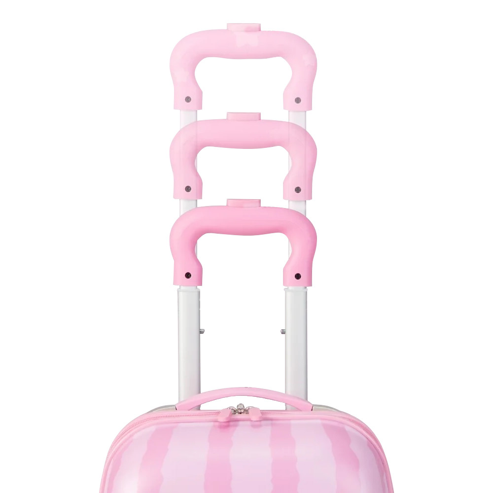 Różowy wzór w paski z jednorożcem daje przyjazną atmosferę, a zestaw ma wygląd odpowiedni dla dzieci. Jest dobrze widoczny na półce bagażowej lub na lotnisku, co ułatwia kontrolę.