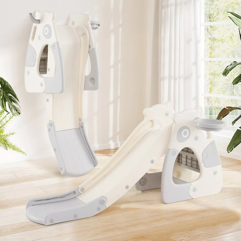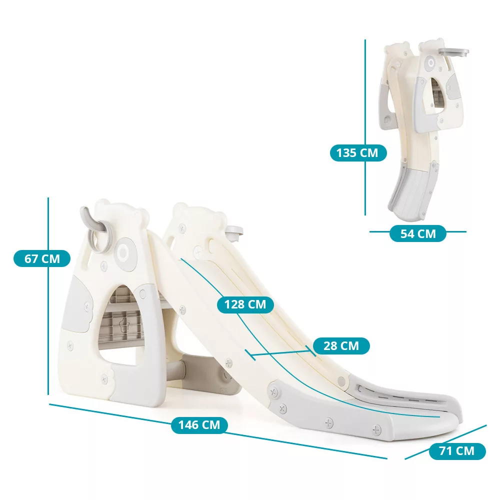 Zjeżdżalnia łatwo się składa, zajmując minimalną przestrzeń, gdy nie jest używana. Solidna konstrukcja z HDPE, antypoślizgowe podkładki i elementy zapobiegające przewróceniu zapewniają stabilne i bezpieczne doświadczenie zabawy.