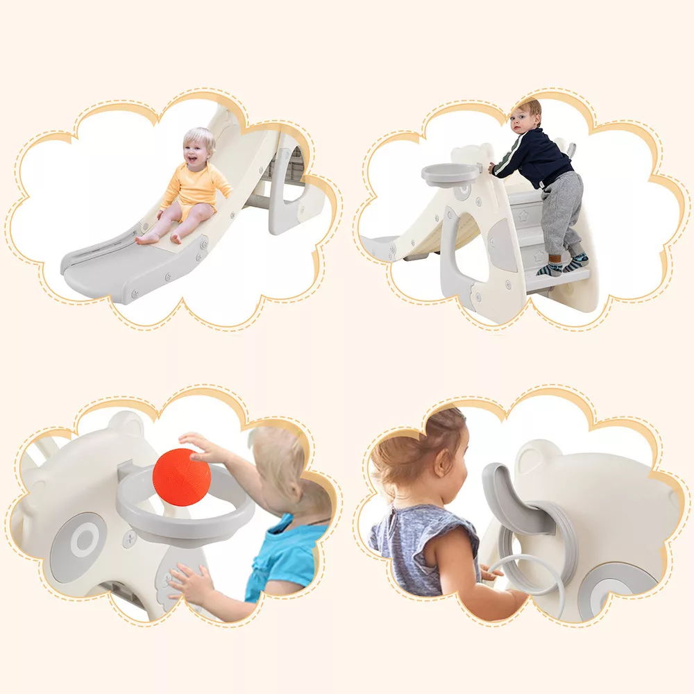 Ta zjeżdżalnia 4-w-1 oferuje zjeżdżanie, wspinanie, rzucanie do kosza i rzucanie pierścieniami w jednym urządzeniu. Różnorodność ruchów pomaga spalić nadmiar energii, jednocześnie utrzymując czas zabawy przyjemnym.